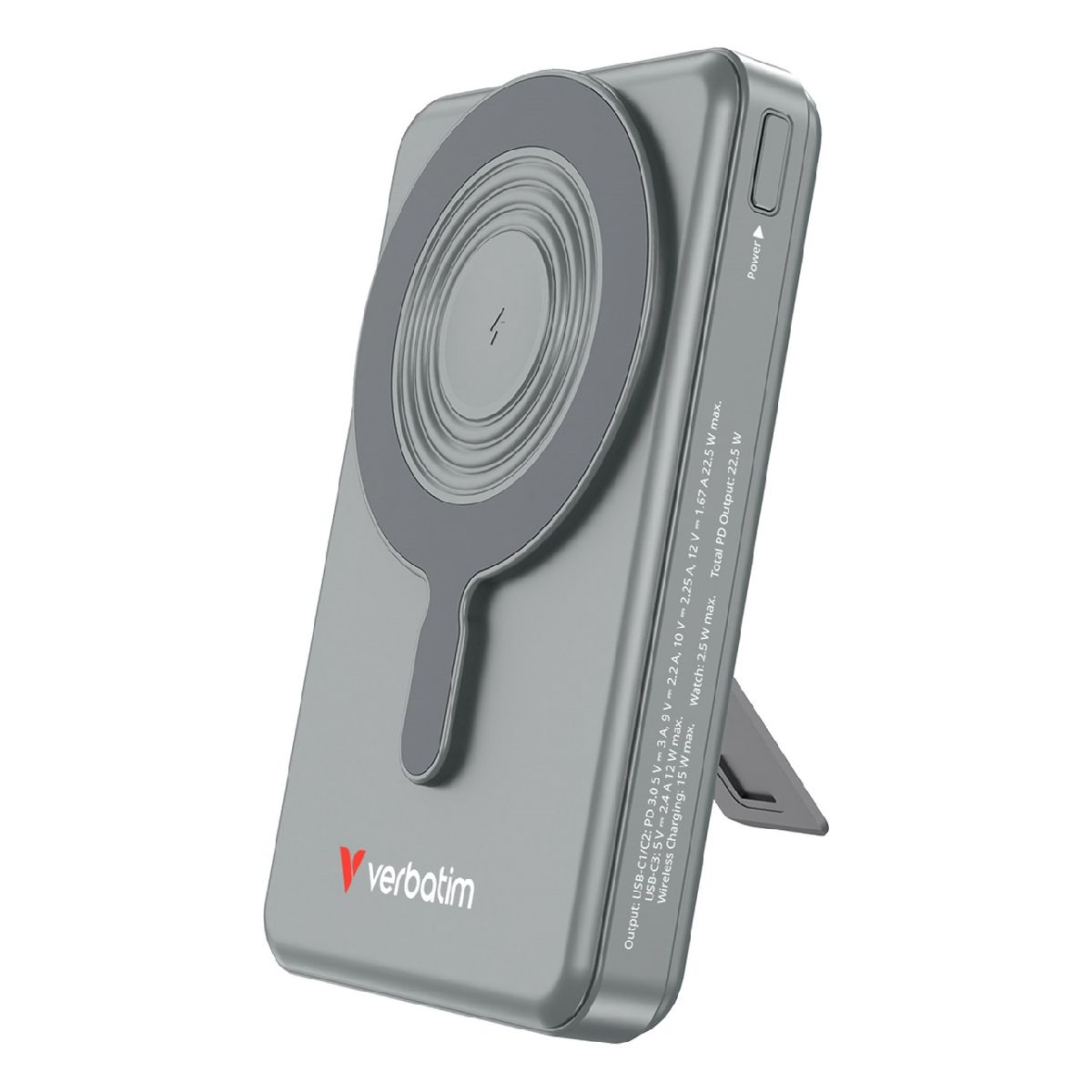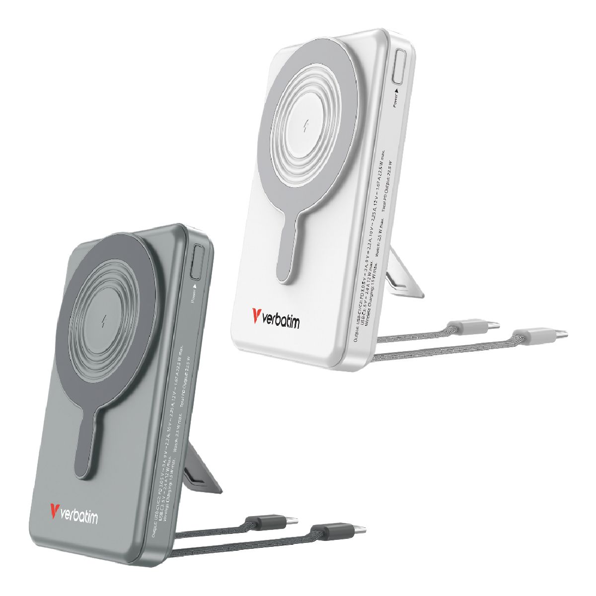 Verbatim Charge 'n' Go 5 合 1 磁性無線行動電源專為擁有多台裝置的使用者設計,提供全面的充電解決方案。這款行動電源配備無線充電板、2 條滿足常見充電需求的內建電纜以及雙向快速充電 USB-C 端口,可讓您同時為多達 4 台設備充電。無論是您的手機、耳機或智慧手錶,這款行動電源都能有效滿足您所有的充電需求。其時尚的設計不僅節省空間,而且無需攜帶多個充電器,簡化了您的充電過程,同時保持連接。