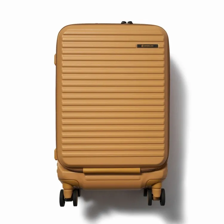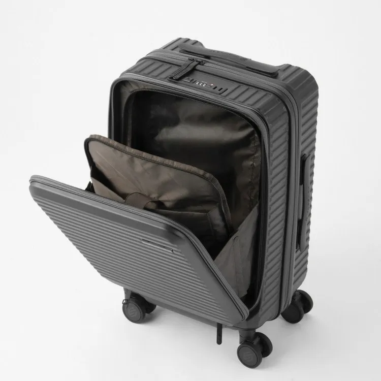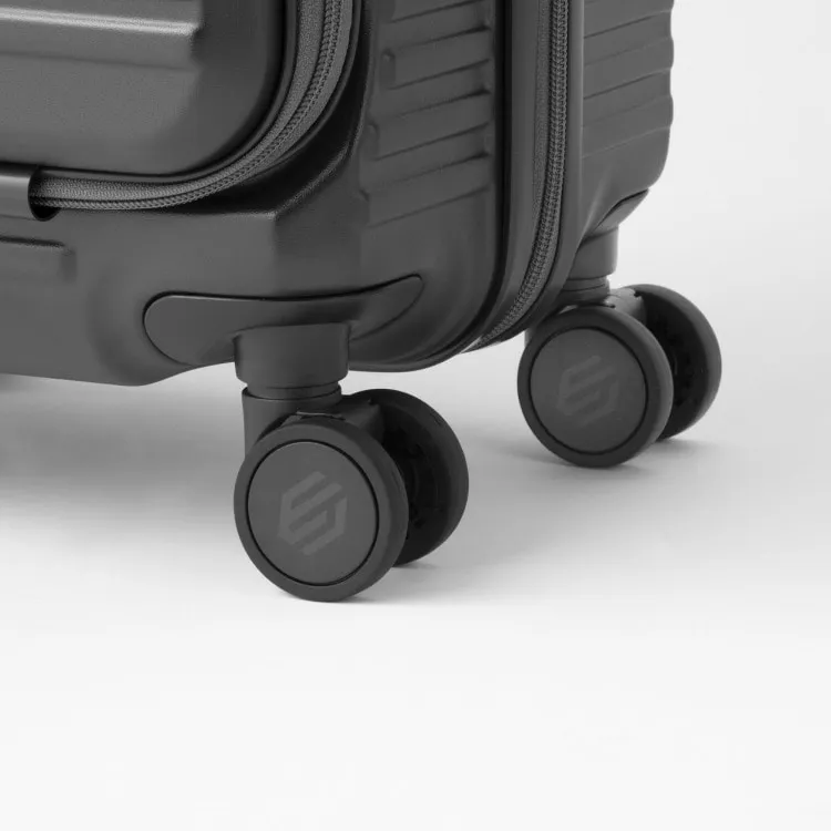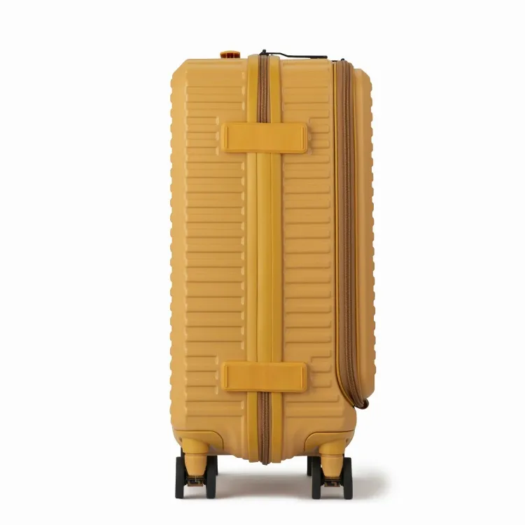 - 這款行李箱配備時尚的前口袋和便捷的腳輪止動器。