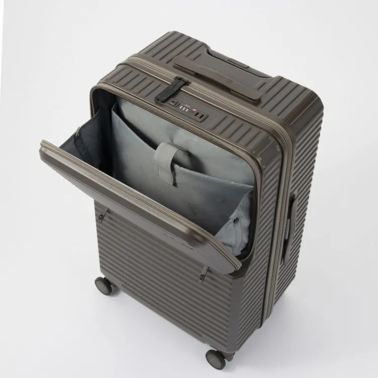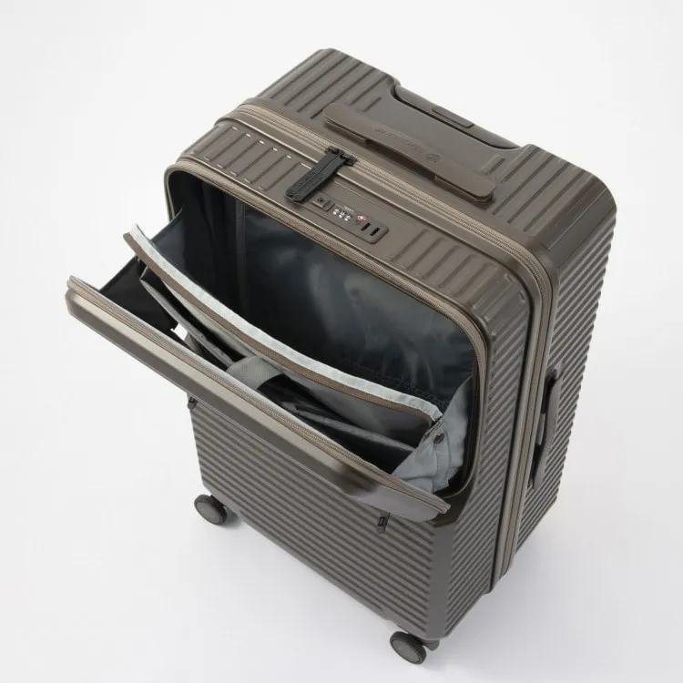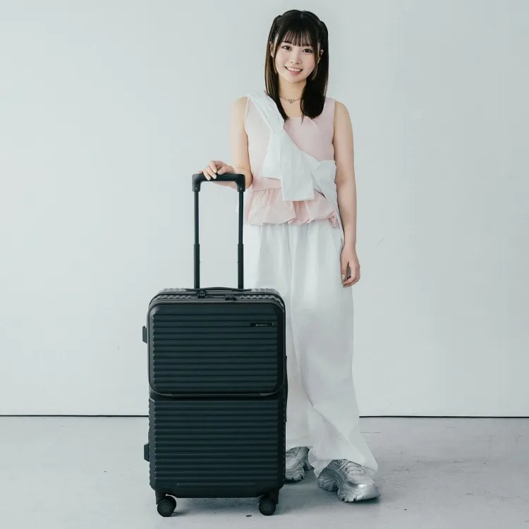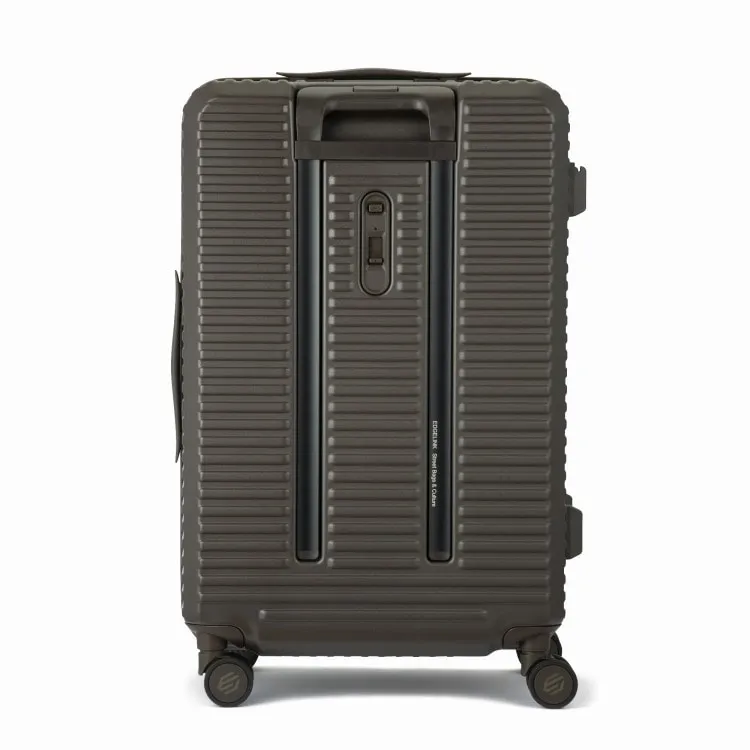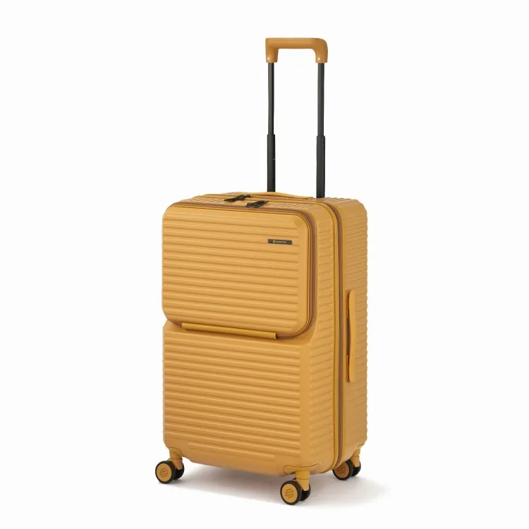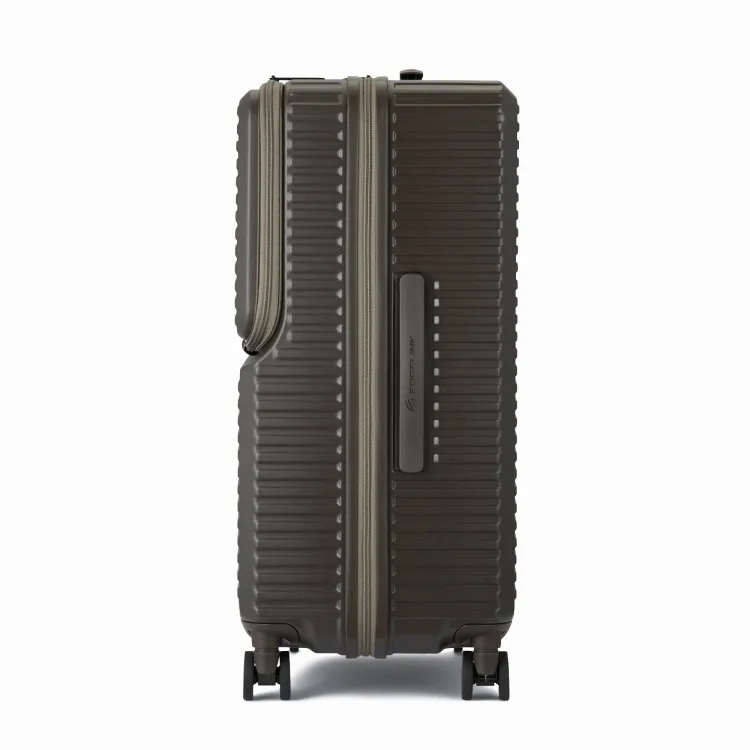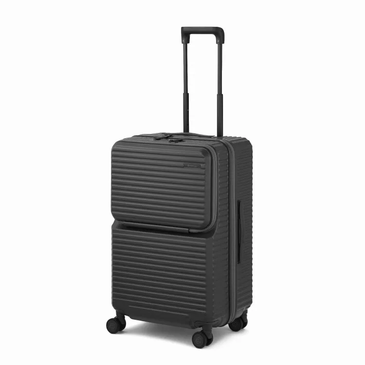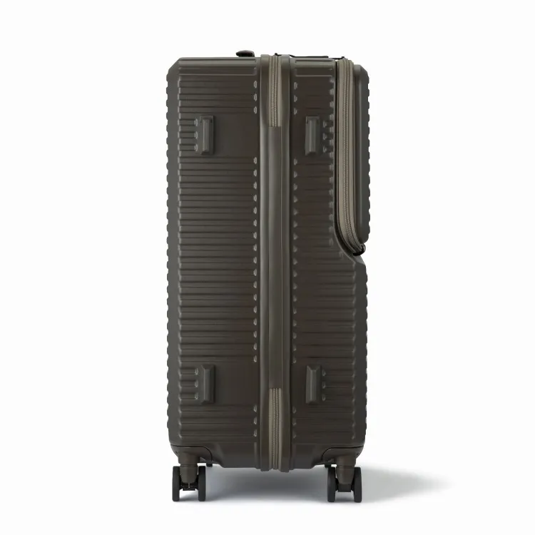 - 這款行李箱配備時尚的前口袋和便捷的腳輪止動器。