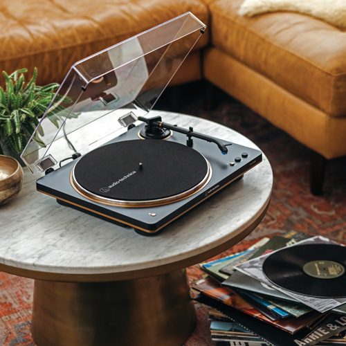 - AT-LP70XBT支援33-1/3和45轉速的唱片,並內建唱頭前級放大器,即使沒有專用唱機輸入端子,也能夠直接連接到家用立體聲音響組合、有源揚聲器和其他組件。其三件式抗共振底盤減少了不必要的諧振噪音,而外部供電適配器將交流/直流的電源轉換移至底盤外部處理,進一步減少了訊號干擾。唱機配有可拆卸的RCA輸出線、45轉轉接器和可拆卸的鉸鏈防塵蓋。提供三種顏色選擇:黑/灰色組合、黑色/青銅色組合、白色/銀色組合。