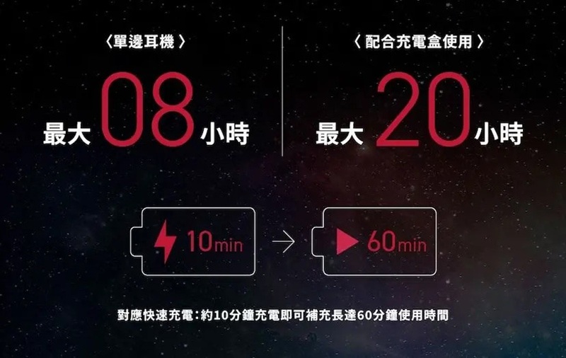 - 最長連續播放時數:每邊耳機 約8小時;連同充電盒 約20小時
