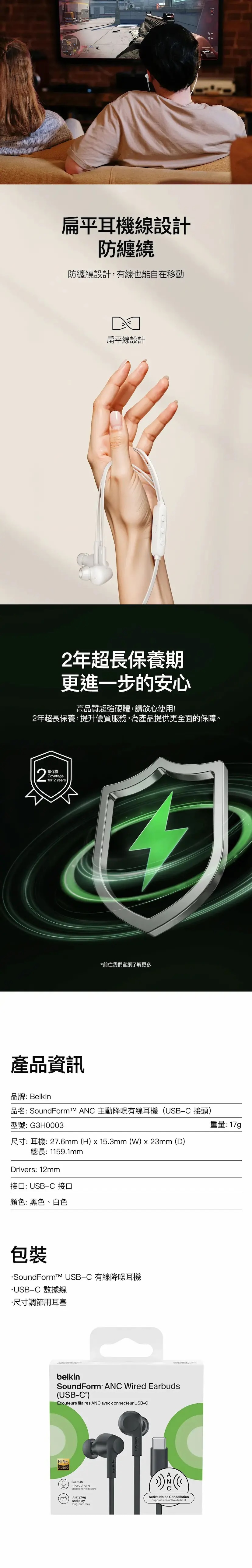 Belkin - SoundForm ANC 主動降噪入耳式有線耳機 配備 USB-C 接頭 - G3H0003 ( 黑色/白色)