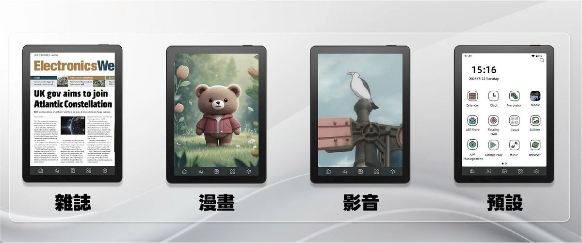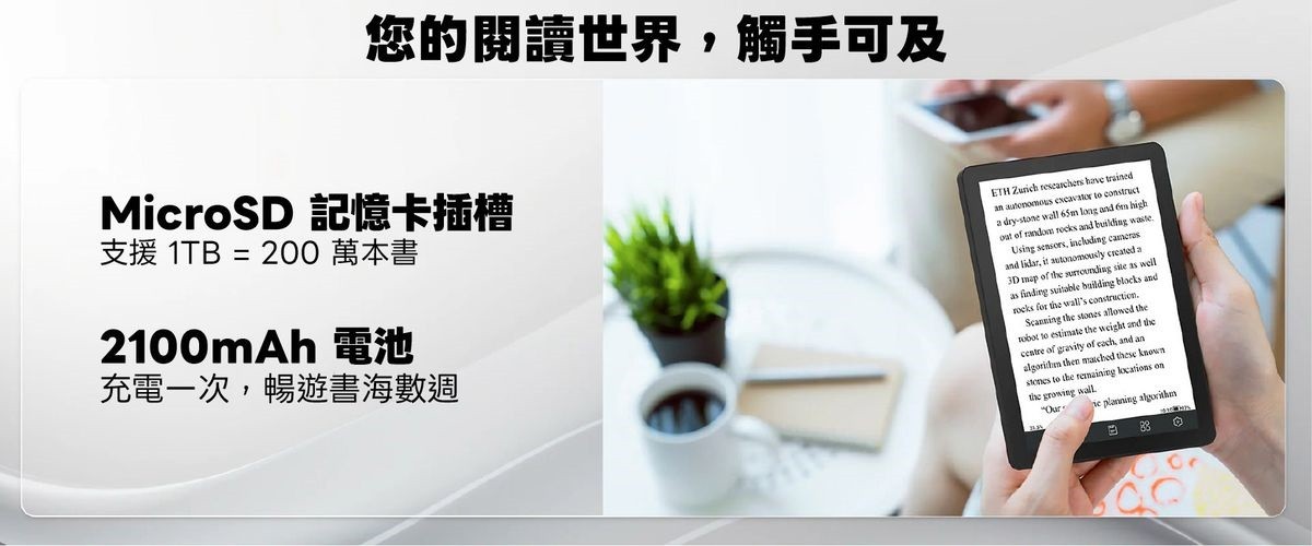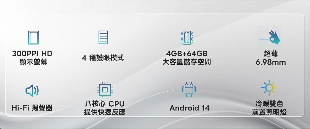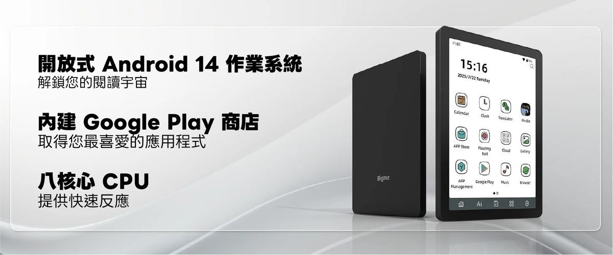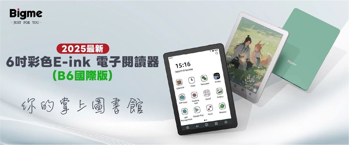 Bigme B6 彩色E-ink 電子閱讀器擁有 6 吋 E-Ink Kaleido 3 彩色螢幕,呈現清晰細膩的文字與生動色彩。搭載 Android 14 開放式作業系統 和 可在 Google Play Store 自由下載各式應用程式,並配備八核心處理器、4GB 記憶體與 64GB 儲存空間,可儲存約40,000本書。機身纖薄輕盈僅 6.98mm,讓您方便隨身攜帶,隨時隨地沉浸在閱讀。無論是小說、漫畫,甚至是雜誌、影片,都能完美呈現!