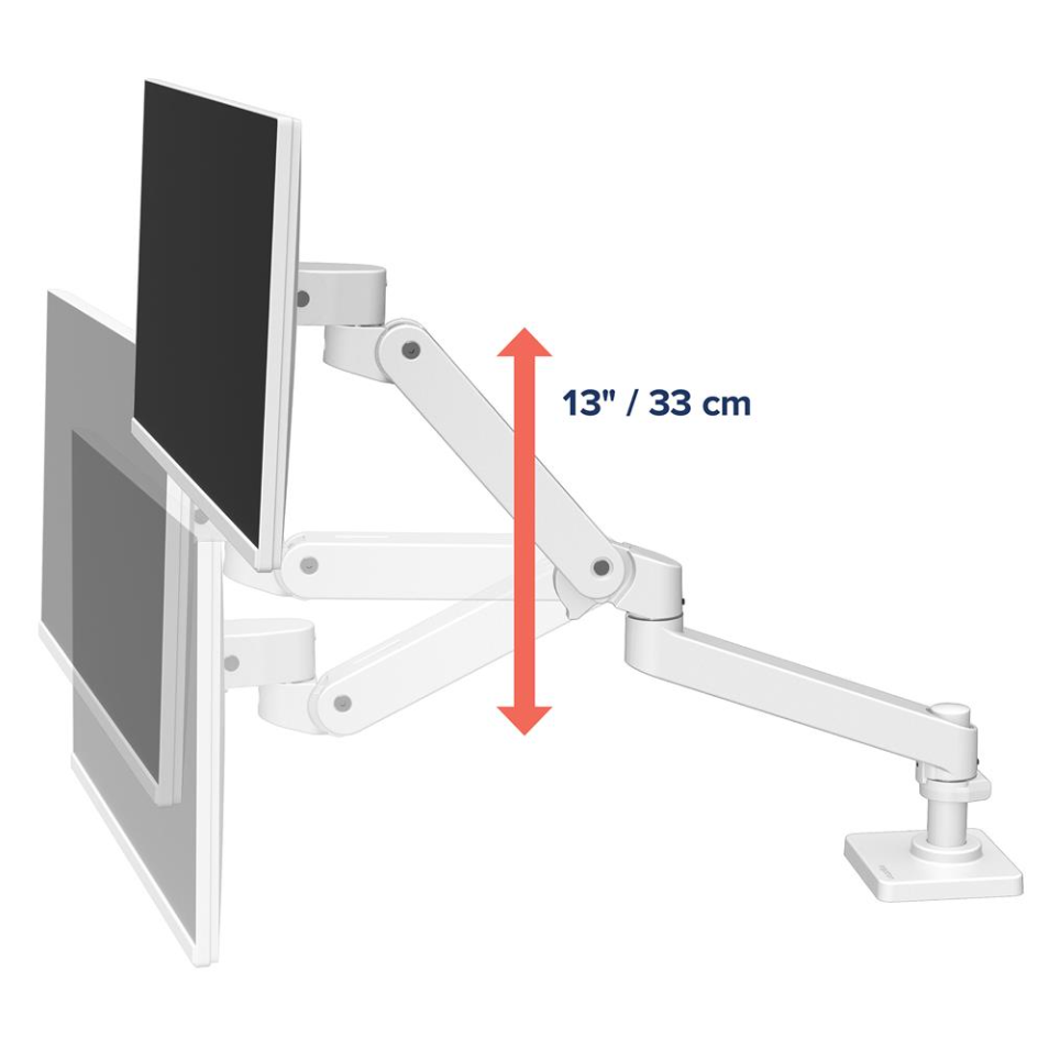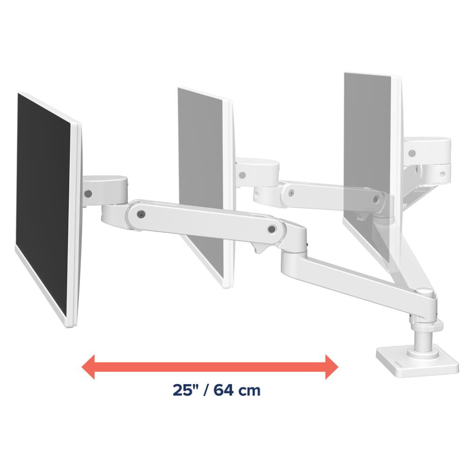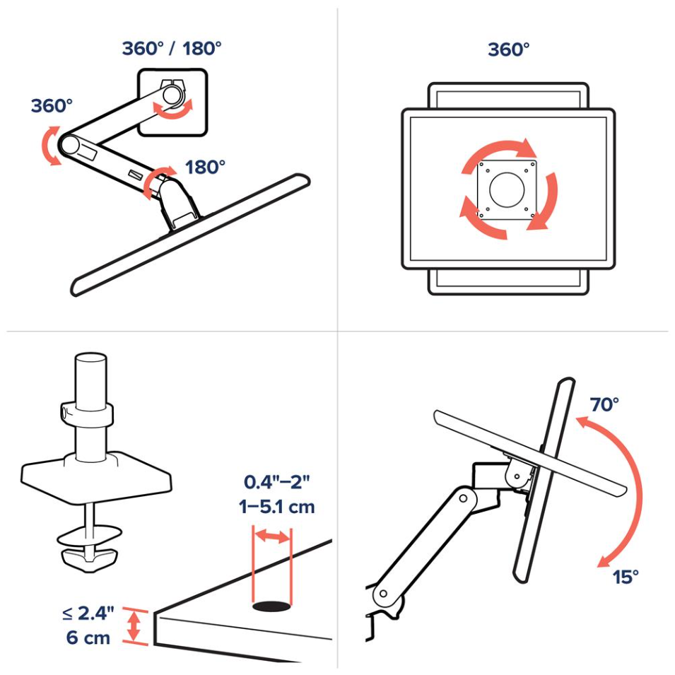 Includes | Arm, extension, monitor pivot, grommet mount or 2-piece desk clamp, 13.5 cm pole, attachment hardware |