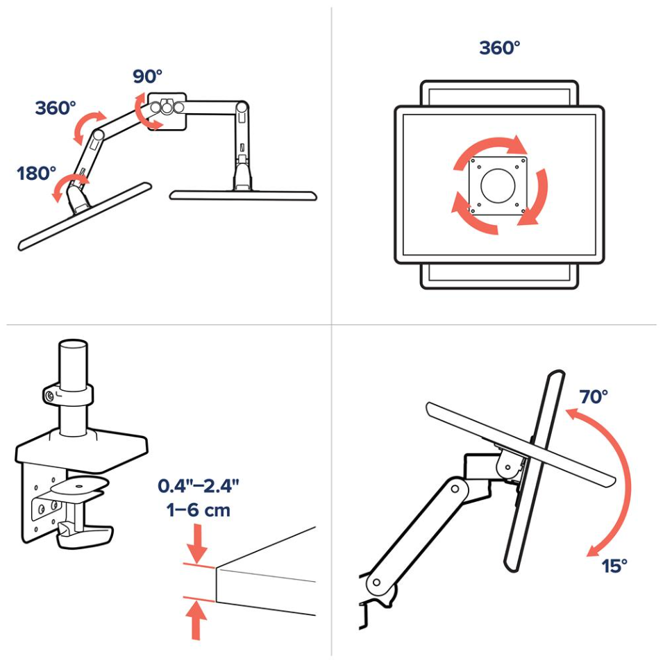 設定一次張力水平,以平衡臂與其顯示器;參考指示器以快速設定多個臂。 - 多功能設計