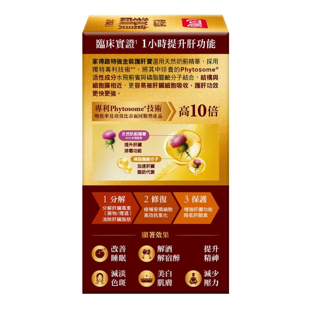 - 家得路特強金裝護肝寶選用高度標準化的天然奶薊精華,採用獨特專利技術**,將其中珍貴的Phytosome®活性成分水飛薊賓與磷脂膽鹼分子結合,結構與細胞膜相近,更容易被肝臟細胞吸收,護肝功效更快更強。