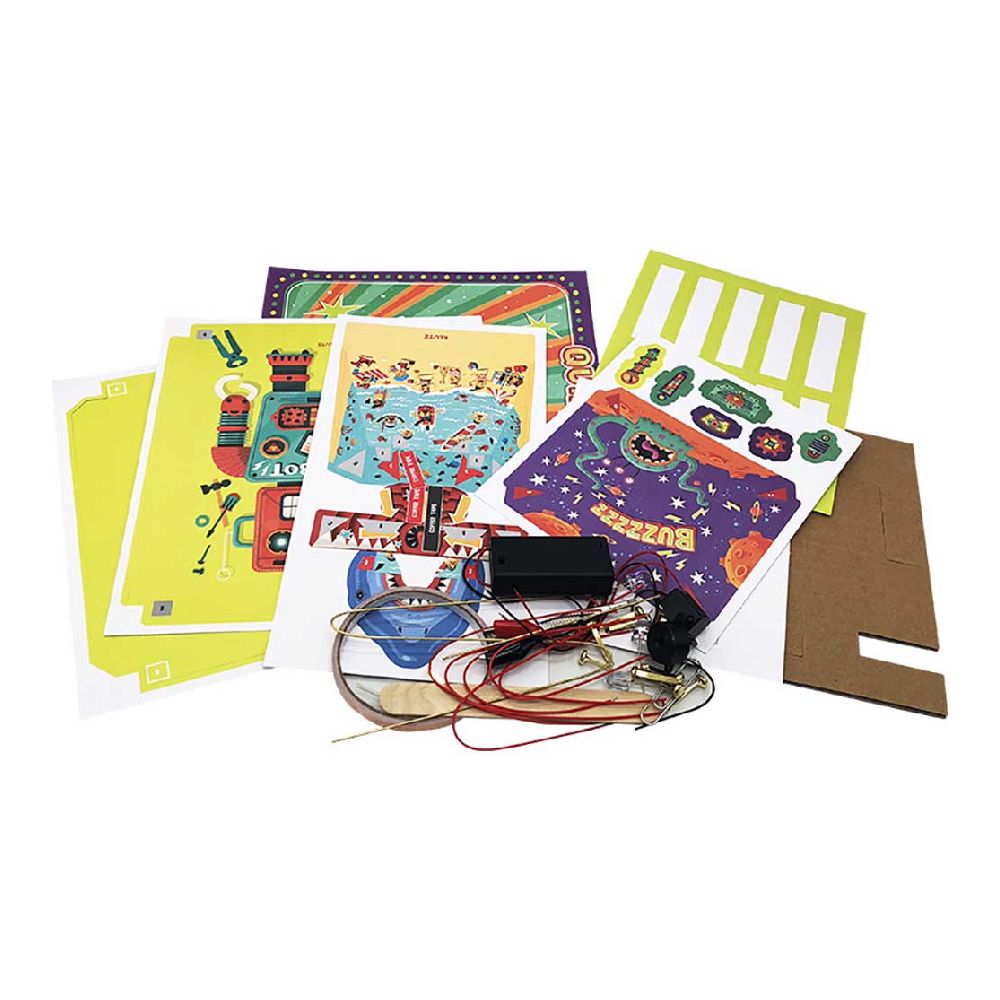 - 配件︰7張模板、1個紙板插件、5棵LED燈、燈線、塗層線、銅線、2個蜂鳴器、電池座、回形針、小棒、鑷子和紙夾