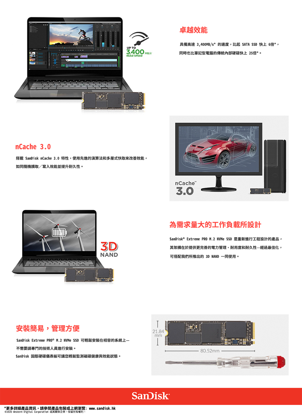 SanDisk® Extreme PRO M.2 NVMe SSD 是重新進行工程設計的產品,其架構在於提供更完善的電力管理、耐用度和耐久性—經過最佳化,可搭配我們所推出的 3D NAND 一同使用。
