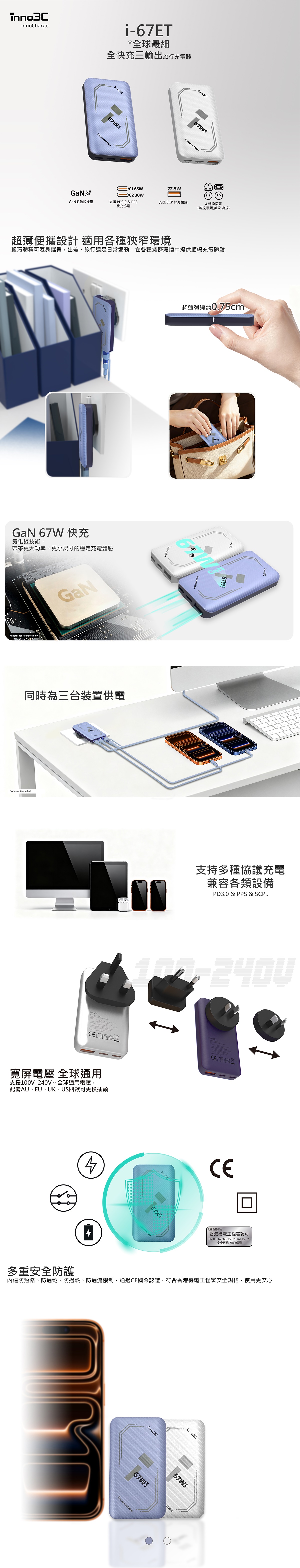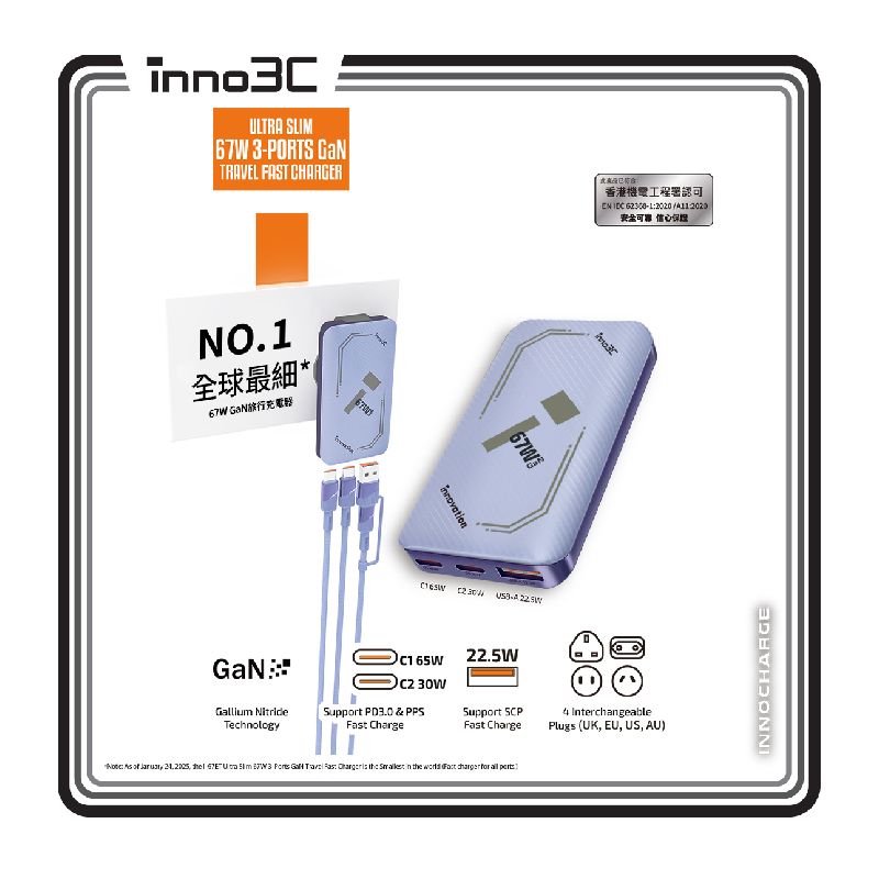 inno3C - i-67ET 超細 67W 三輸出 GaN 旅行快速充電器 | PD 3.0 / PPS 快速充電旅行充電器 | USB 充電器 | 全球旅行通用
