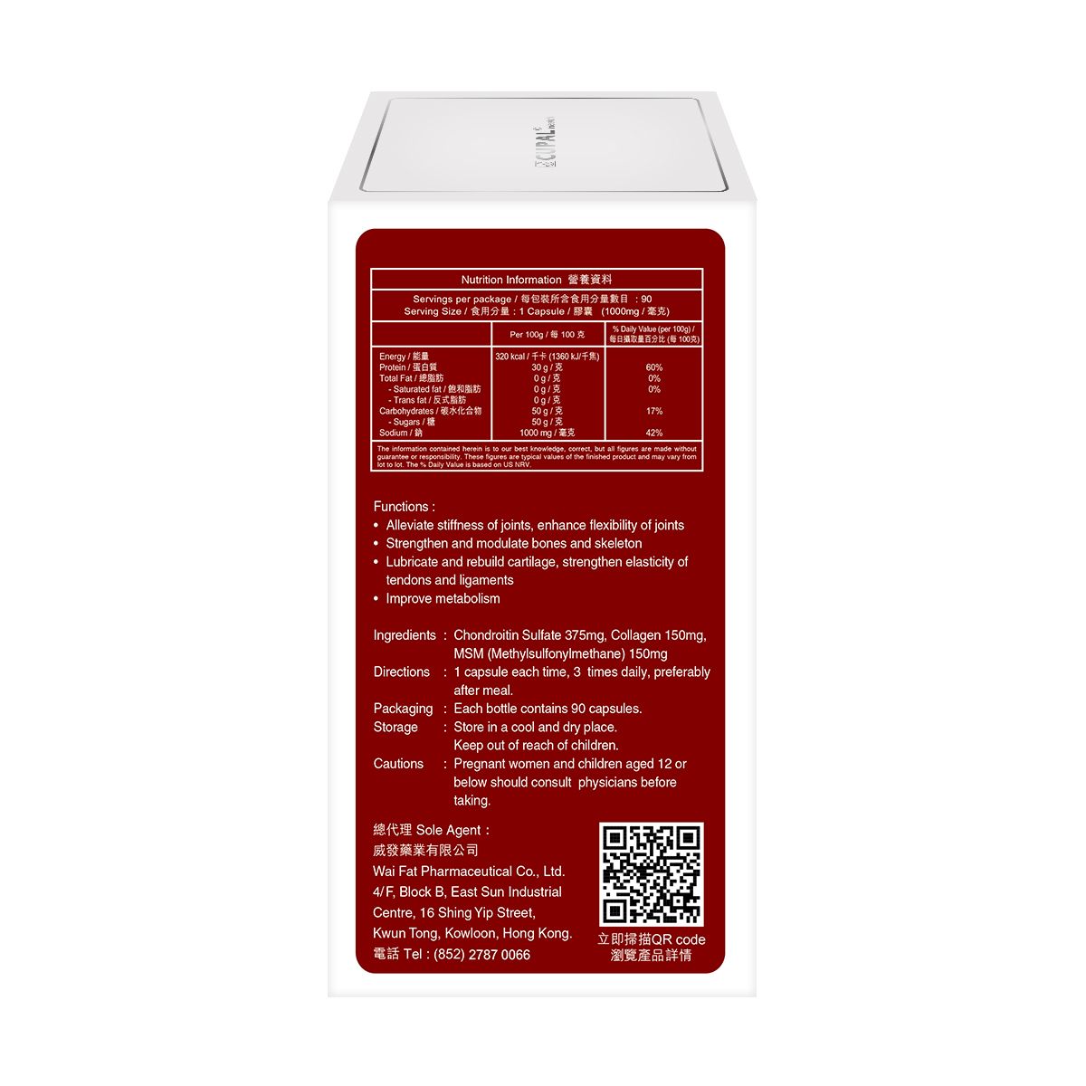 - 軟骨素375毫克、骨膠原150毫克、有機硫(MSM)150毫克
