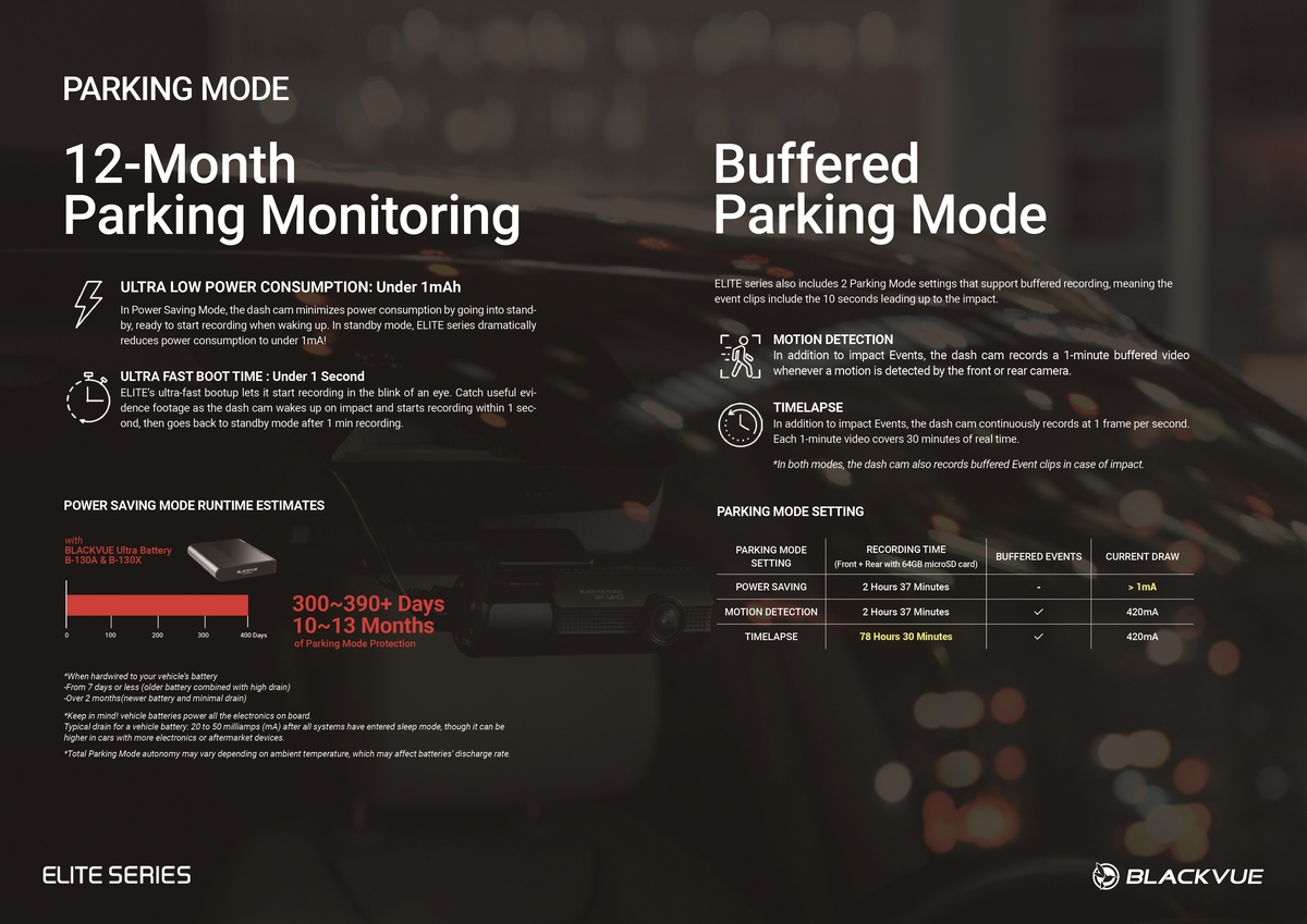- 停車錄影模式*:省電 / 動作偵測 / 低電壓切斷