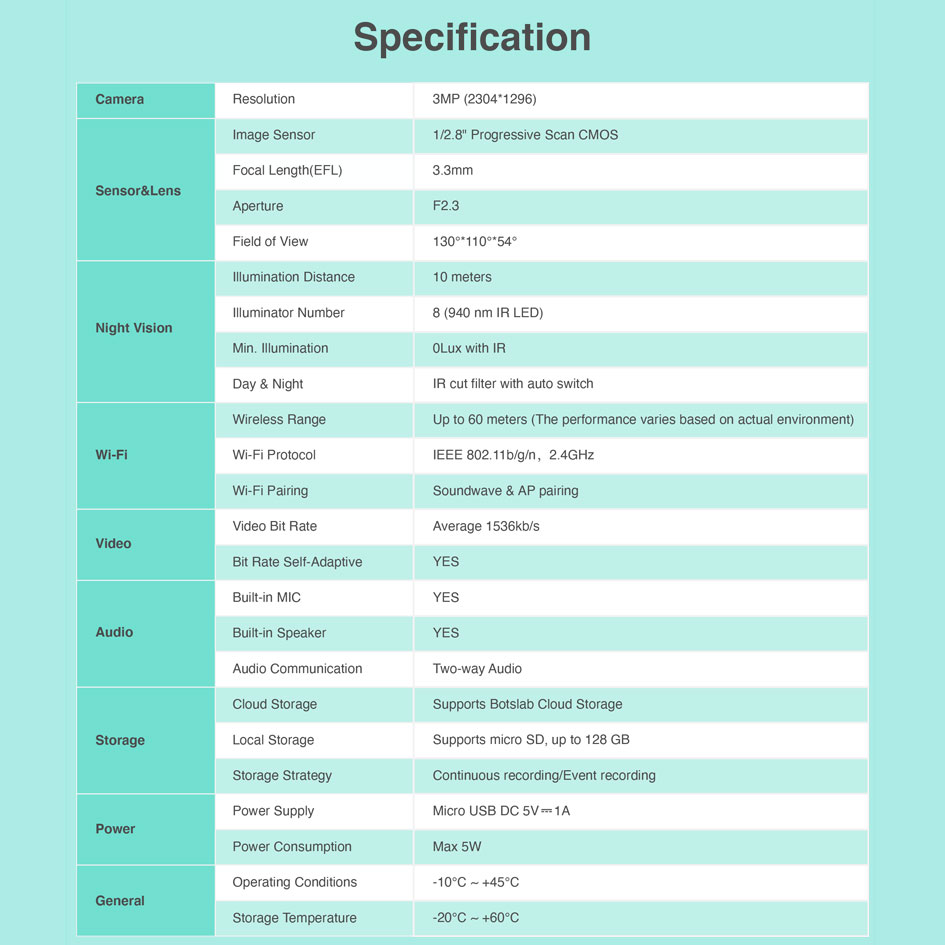 - 超强夜野、逆光矯正、低光全彩、移動偵測、哭聲偵測、智能人形識别