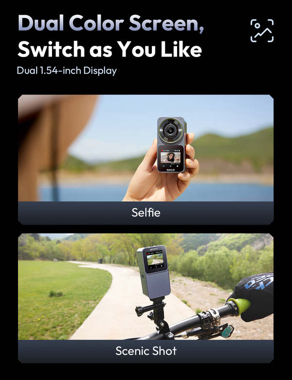 - 可安装在電單車/單事上,更可變身為運動相機前後高清雙屏幕, 前景或自拍一鍵轉换