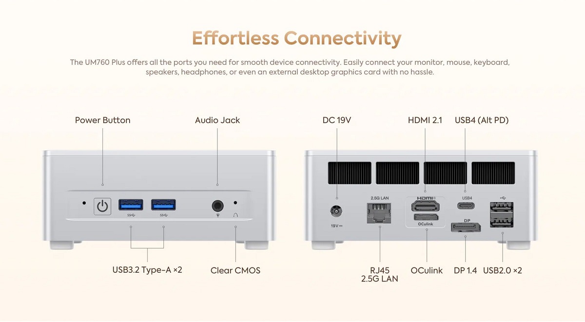 - HDMI (2.1) x 1, DisplayPort (1.4) x 1, USB 4 Type-C x 1, Oculink x1