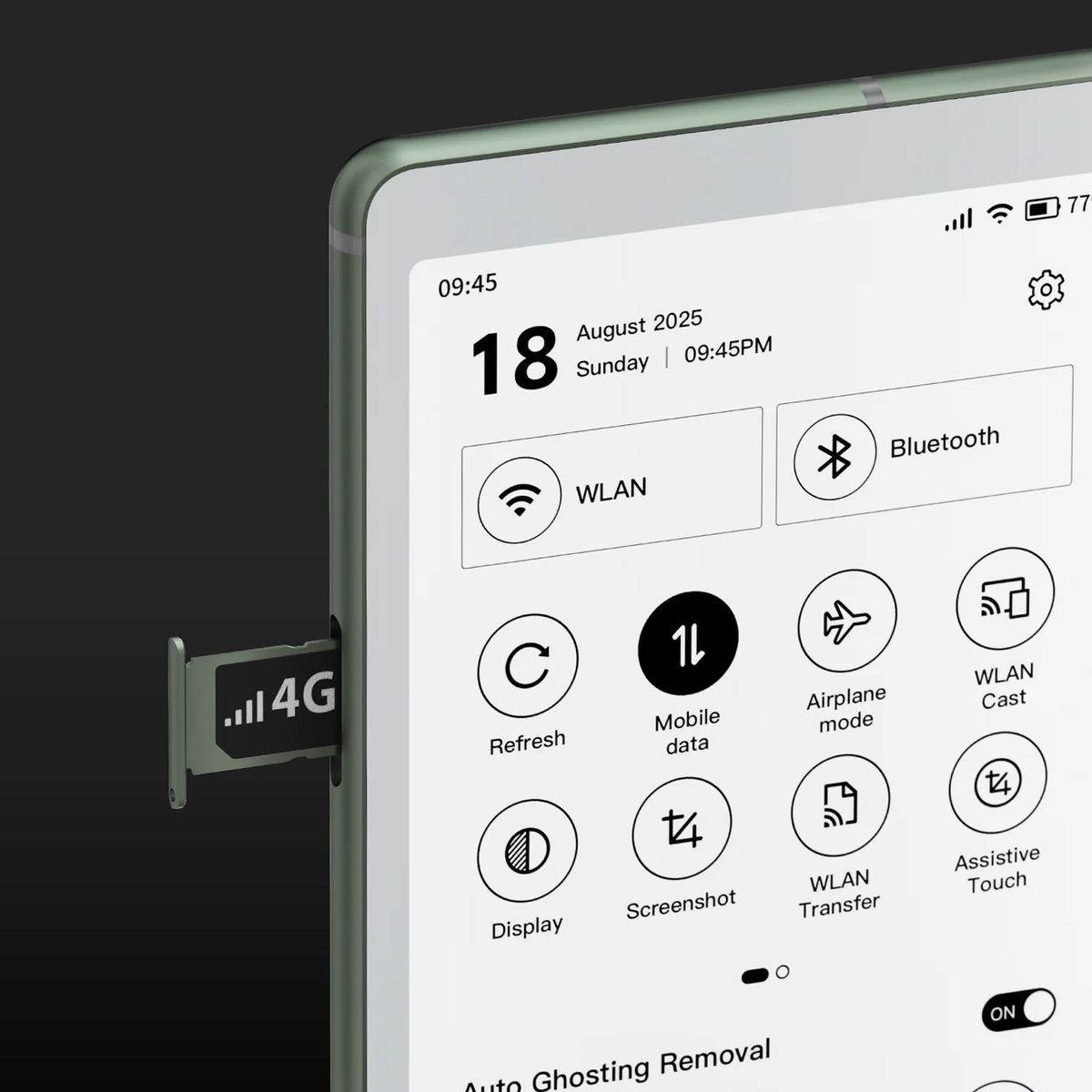 此裝置配備 SIM 卡插槽,支援 4G LTE 行動數據連接,主要用於隨時隨地存取閱讀材料和AI服務。