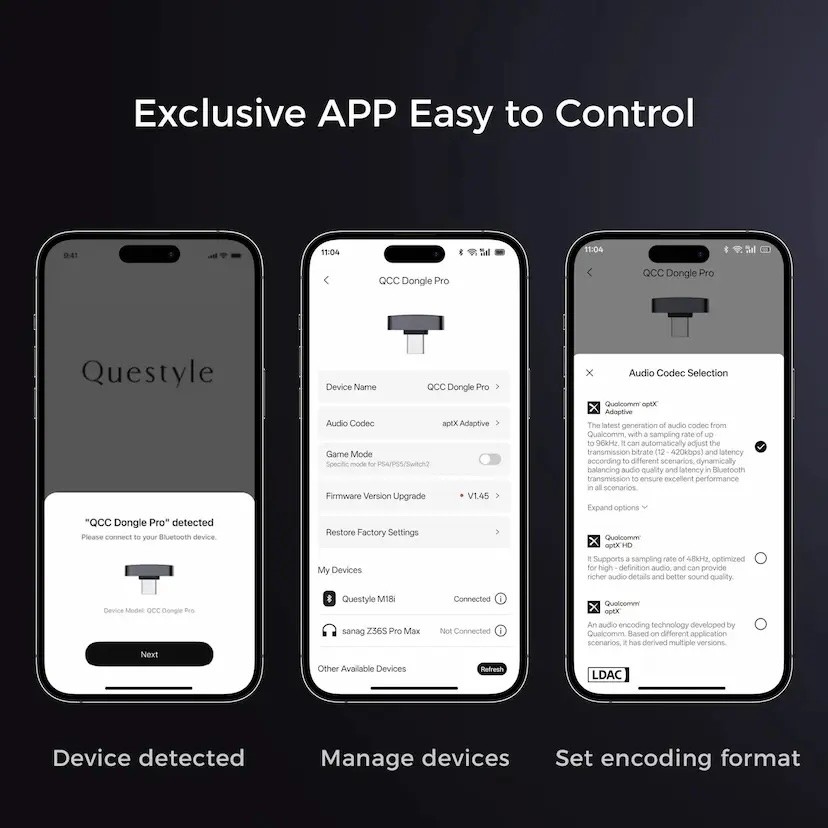 QCC Dongle & QCC Dongle Pro配備專屬APP,賦予使用者前所未有的自由與彈性。透過這款精心設計的APP,你能快速完成裝置連接管理,一鍵實現裝置升級,還可輕鬆調整藍牙音訊編碼格式,依據個人喜好或使用場景自訂音質表現。