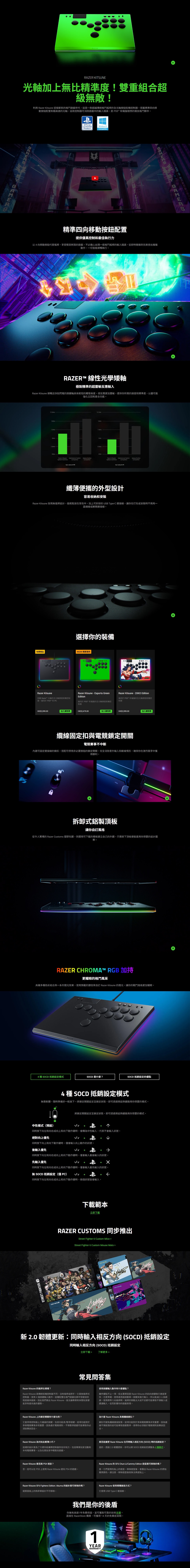 利用 Razer Kitsune 迎接嶄新的格鬥遊戲世代,這是一款超越傳統格鬥搖桿的全光軸按鈕街機控制器。搭載精準四向移動按鈕配置和極高速的光軸,這款控制器可消除遊戲中的輸入錯誤,是 PS5™ 和電腦理想的競技格鬥夥伴。
