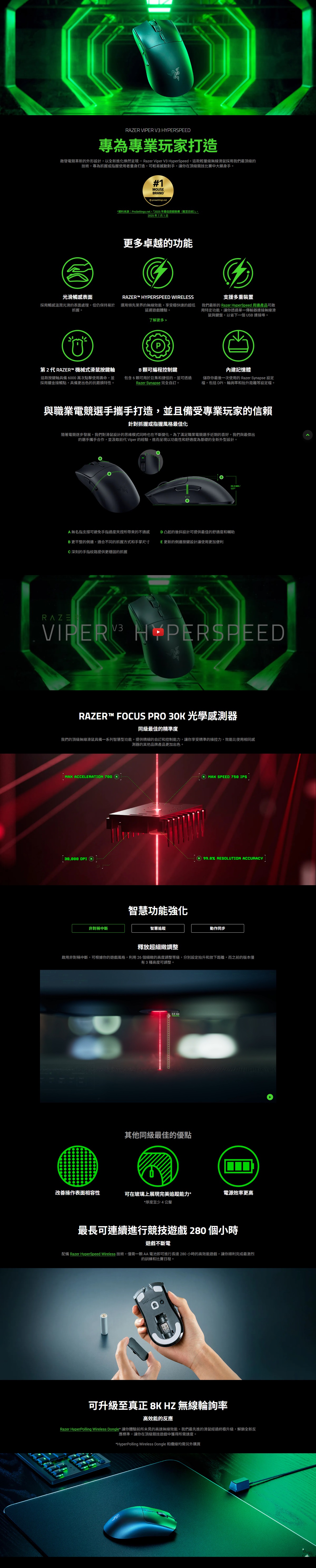 啟發電競革新的外形設計,以全新進化煥然呈現 — Razer Viper V3 HyperSpeed。這款輕量級無線滑鼠採用我們最頂級的技術,專為抓握或指握使用者量身打造,可輕易撼動對手,讓你在頂級競技比賽中大顯身手。