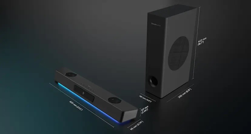 Sound Blaster Katana V2X 配有一個較小的重低音喇叭,用於優化設計的音訊系統,在不影響音訊品質的情況下最大限度地減少占地面積。