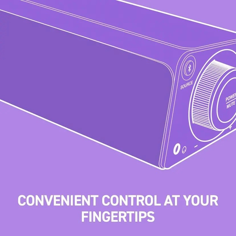 音量控制旋鈕和音源按鈕位於條形喇叭的側面,方便觸及,易於控制。