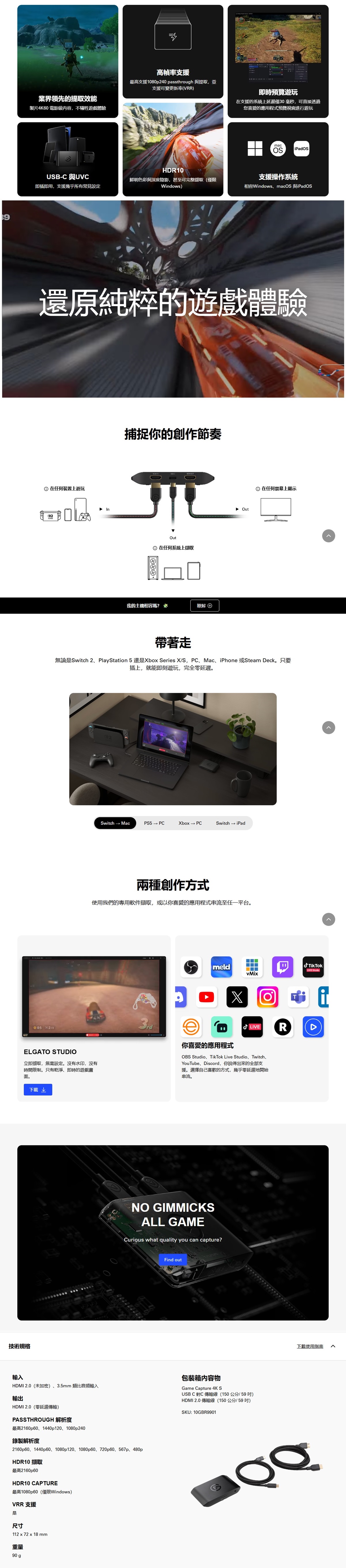 - 包裝箱內容物︰Game Capture 4K S、USB C 對C 傳輸線 (150 公分/ 59 吋)、HDMI 2.0 傳輸線 (150 公分/ 59 吋)
