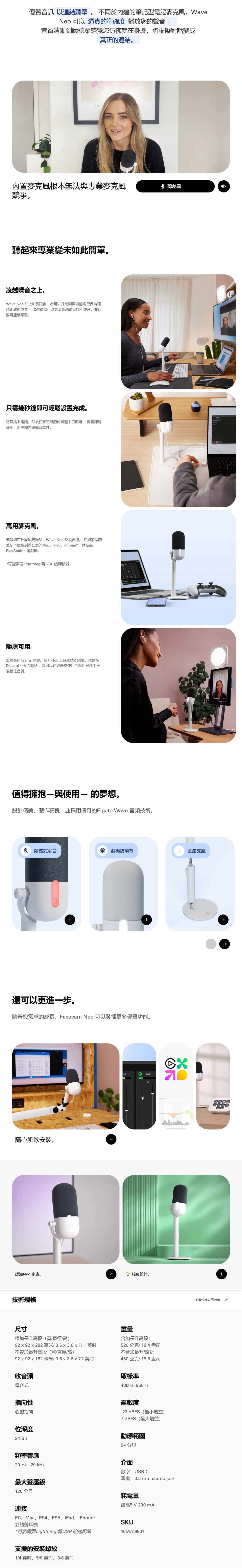優質音訊以連結聽眾。不同於內建的筆記型電腦麥克風,Wave Neo 可以逼真的準確度播放您的聲音。音質清晰到讓聽眾感覺您彷彿就在身邊,將虛擬對話變成真正的連結。