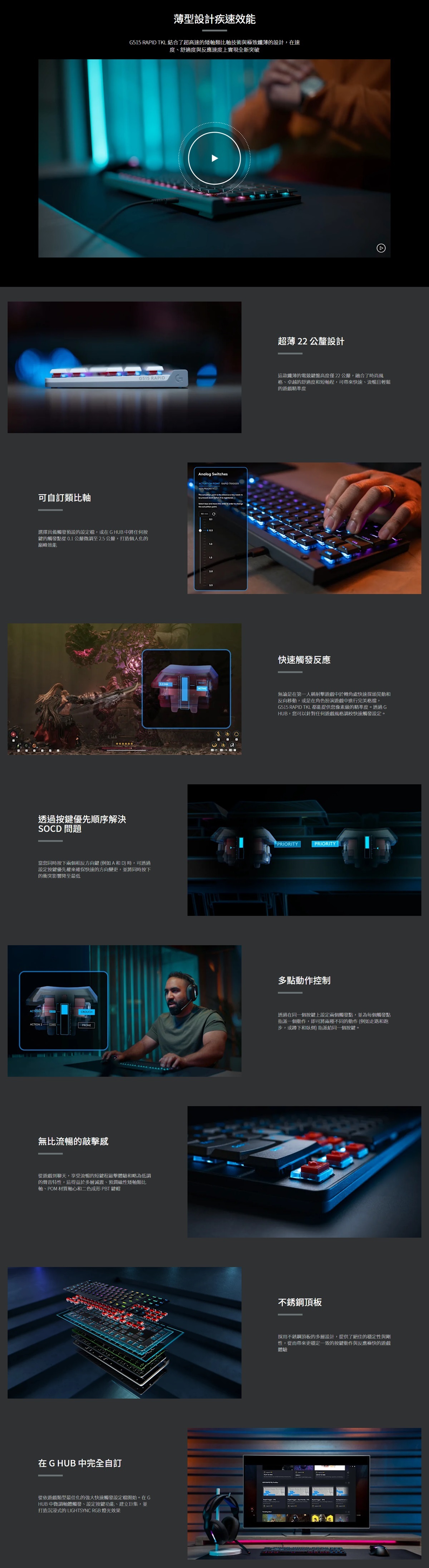 - 按鍵優先順序、快速觸發、多點動作︰*進階功能需要安裝 Logitech G HUB 軟體,此軟體可前往 logitechg.com/ghub 下載
