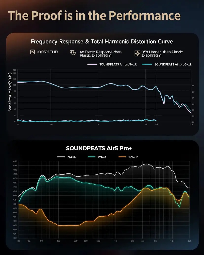 Air5 Pro+ 的核心是一套結合先進 MEMS(微機電系統)與動圈技術的混合驅動系統。MEMS 驅動單元提供極為靈敏、細緻的中高頻,而動圈單元則帶來強勁、共鳴的低頻。兩者合奏,呈現出精準平衡且情感豐富的聲音——清晰、準確與深度的生動和諧。