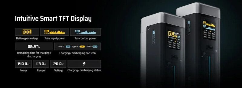- 智慧型 TFT 顯示幕:即時顯示電量、功率、電壓與電流,資訊清晰易讀,方便隨時掌握充電狀態。