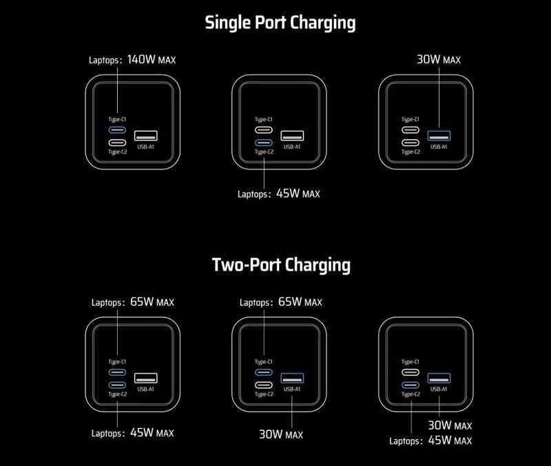 USB-A1 & Type-C1 & Type-C2: 5V=6A 9V=6A 12V=6A 15V=6A 20V=9A 210W MAX