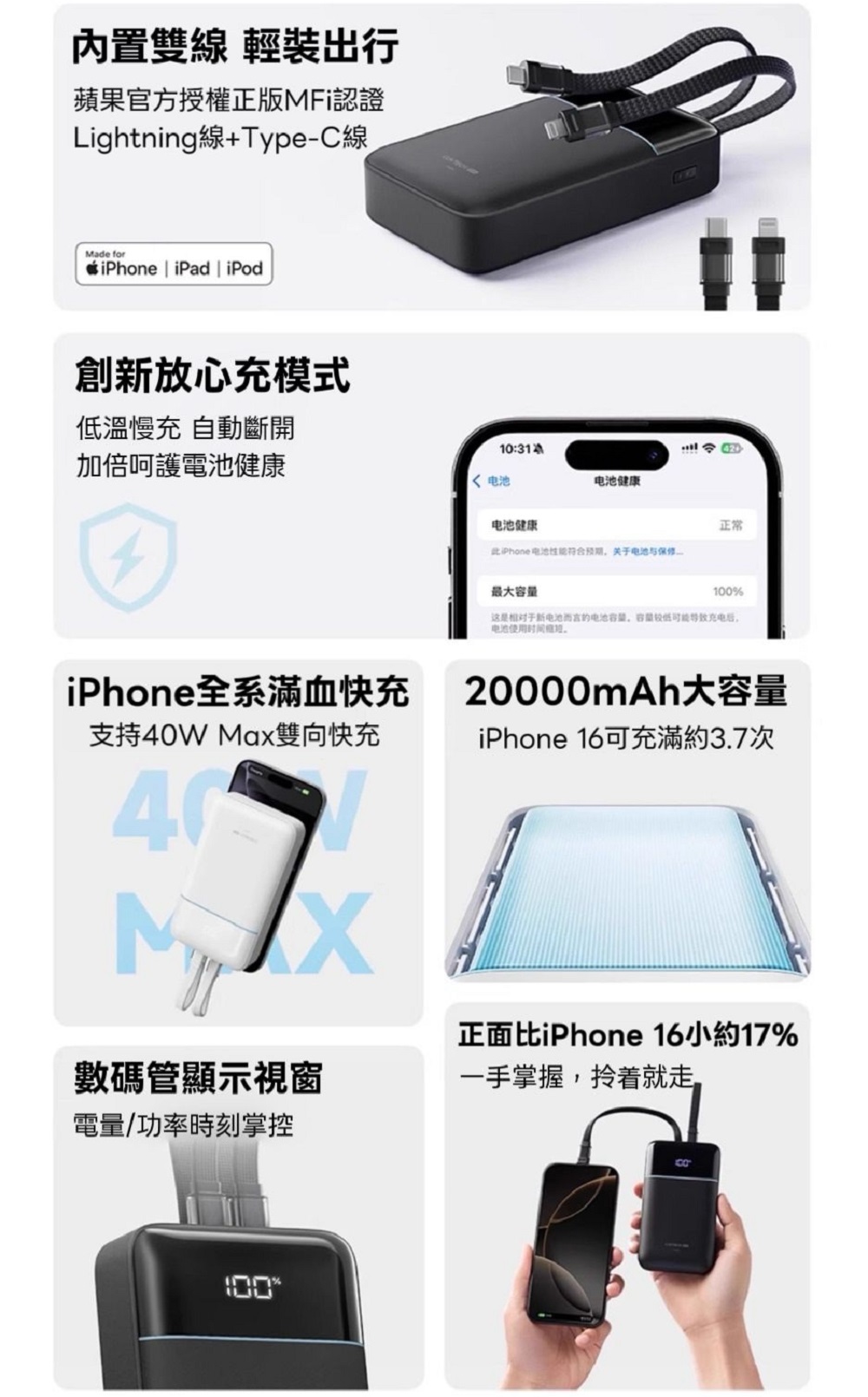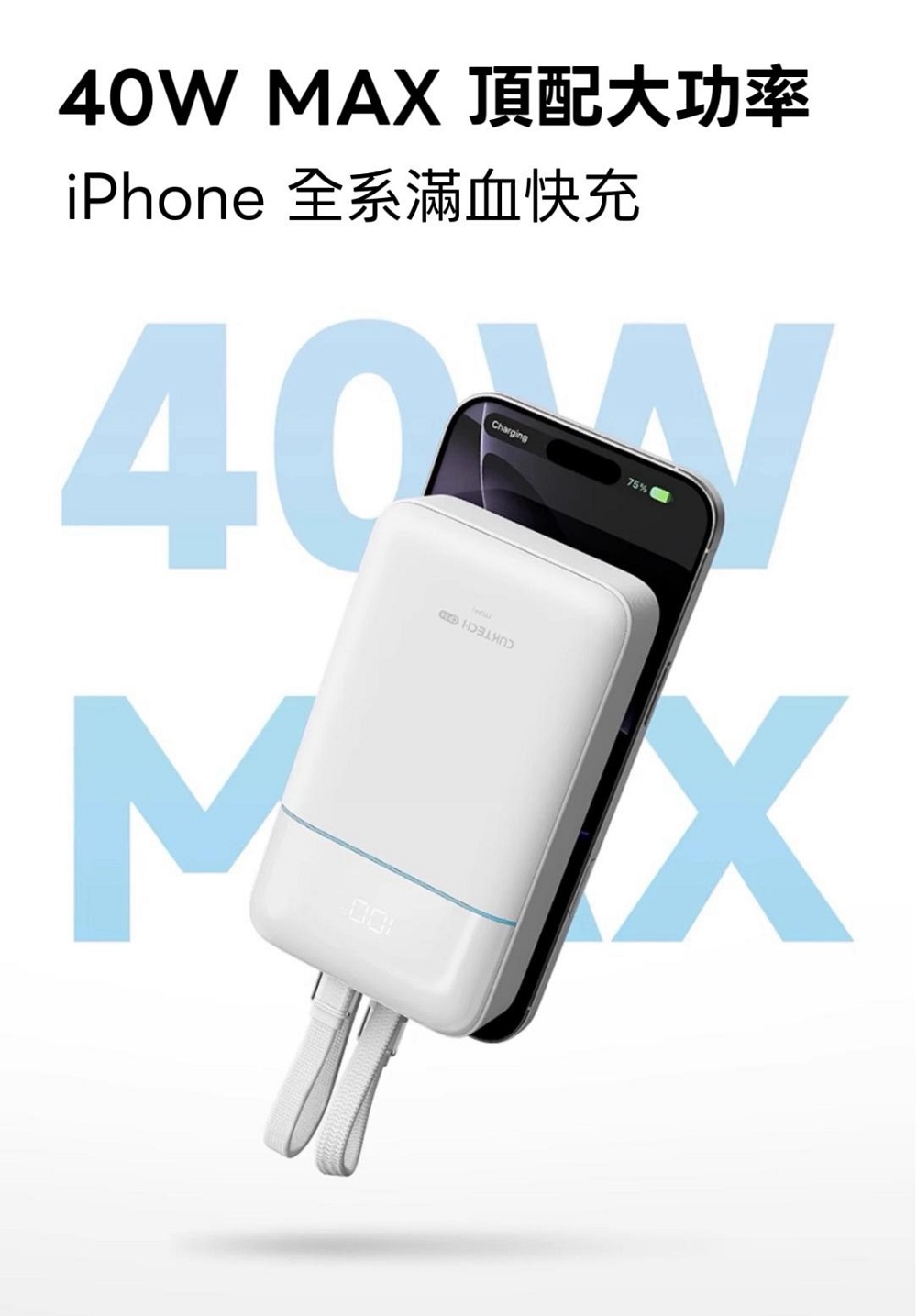 - iPhone 全系滿血快充:支援 40W MAX 雙向快充,速度更快更穩定。