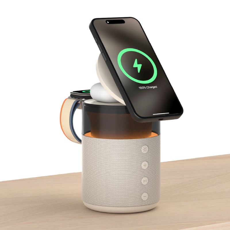 - 5合1多功能:結合無線充電、藍牙喇叭、氛圍夜燈、手機支架與桌面裝飾。