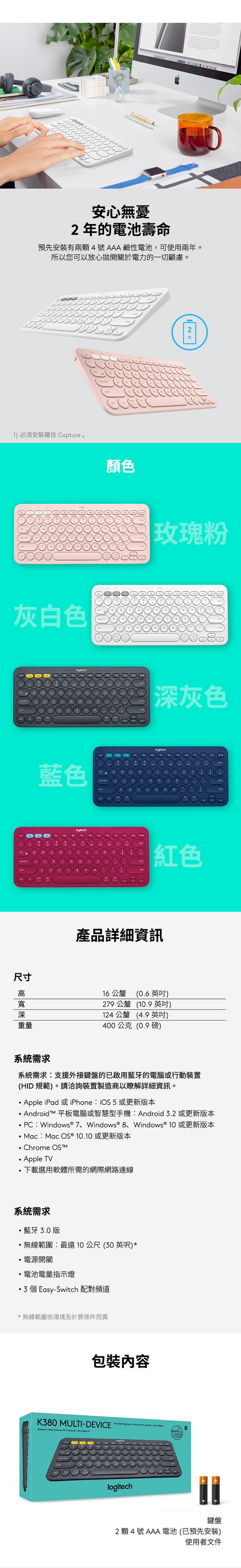 - 包裝內容:鍵盤,2顆 4號 AAA 電池(預裝),使用者文件