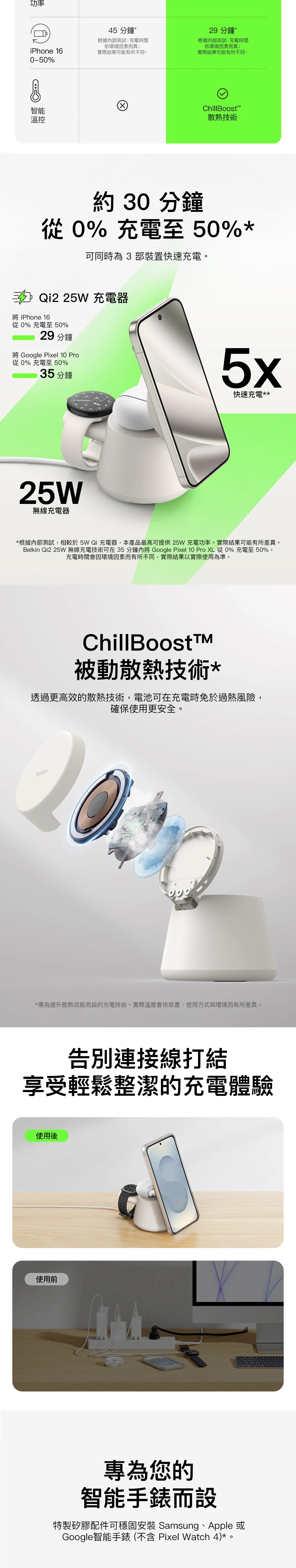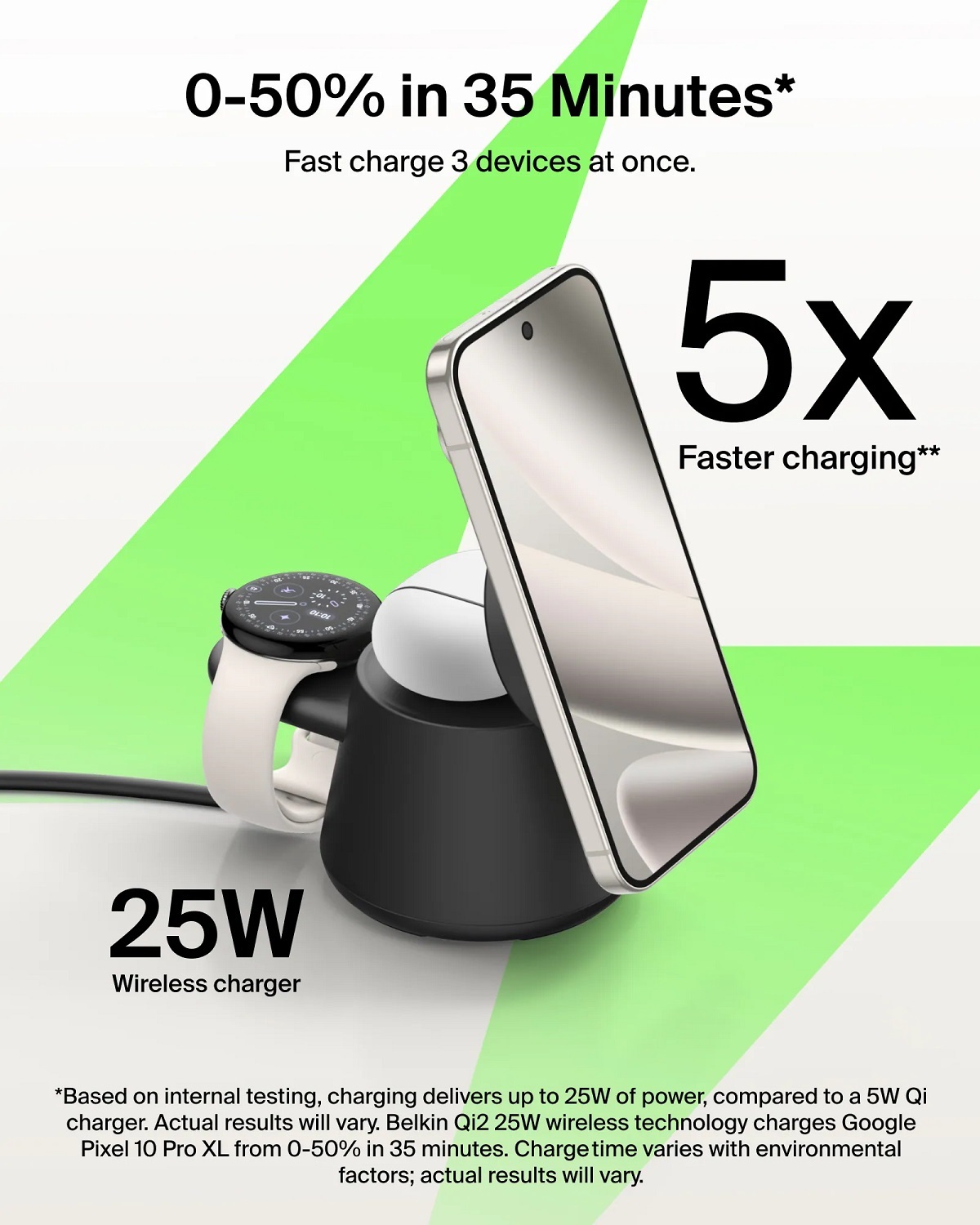 • 提供最高 25W 的快速無線充電效能,速度可達傳統 Qi 充電器的 5 倍†