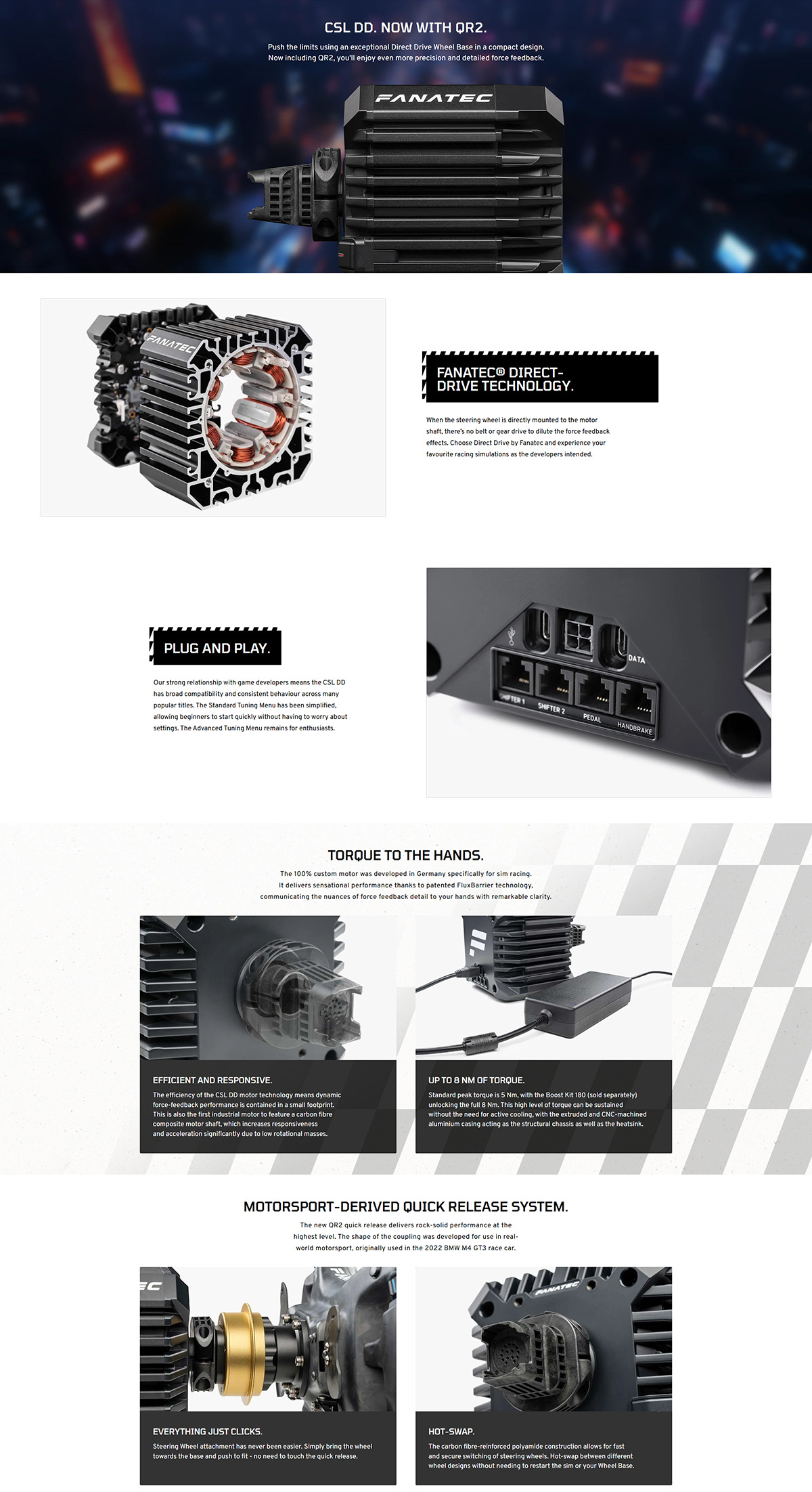 - PC:CSL DD QR2 基座需搭配 Fanatec 方向盤使用方可相容於 PC。請查閱各方向盤產品頁面確認基座相容性。
