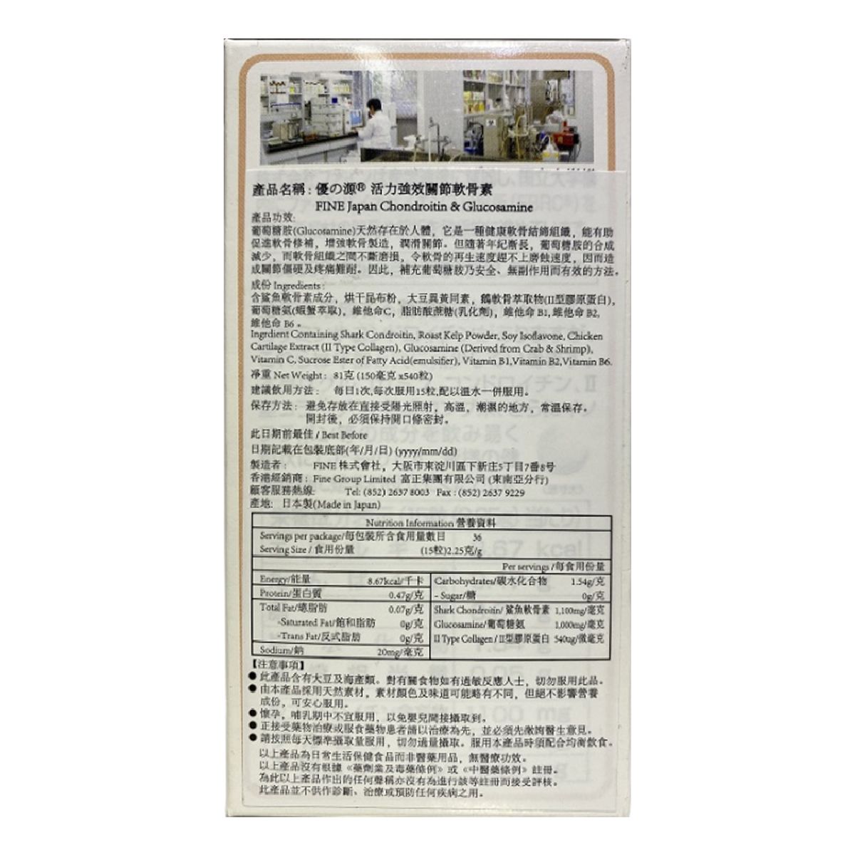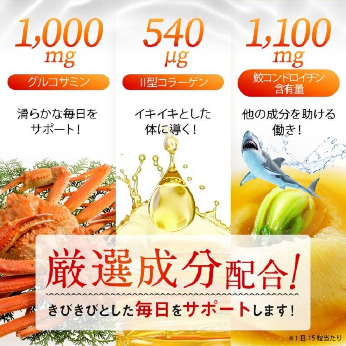 鯊魚軟骨素成分,烘乾昆布粉,大豆異黃同素,鶏軟骨萃取物(Ⅱ型膠原蛋白),葡萄糖胺(提取自蝦蟹),維他命C,蔗醣脂肪酸,維他命B1,維他命B2,維他命B6