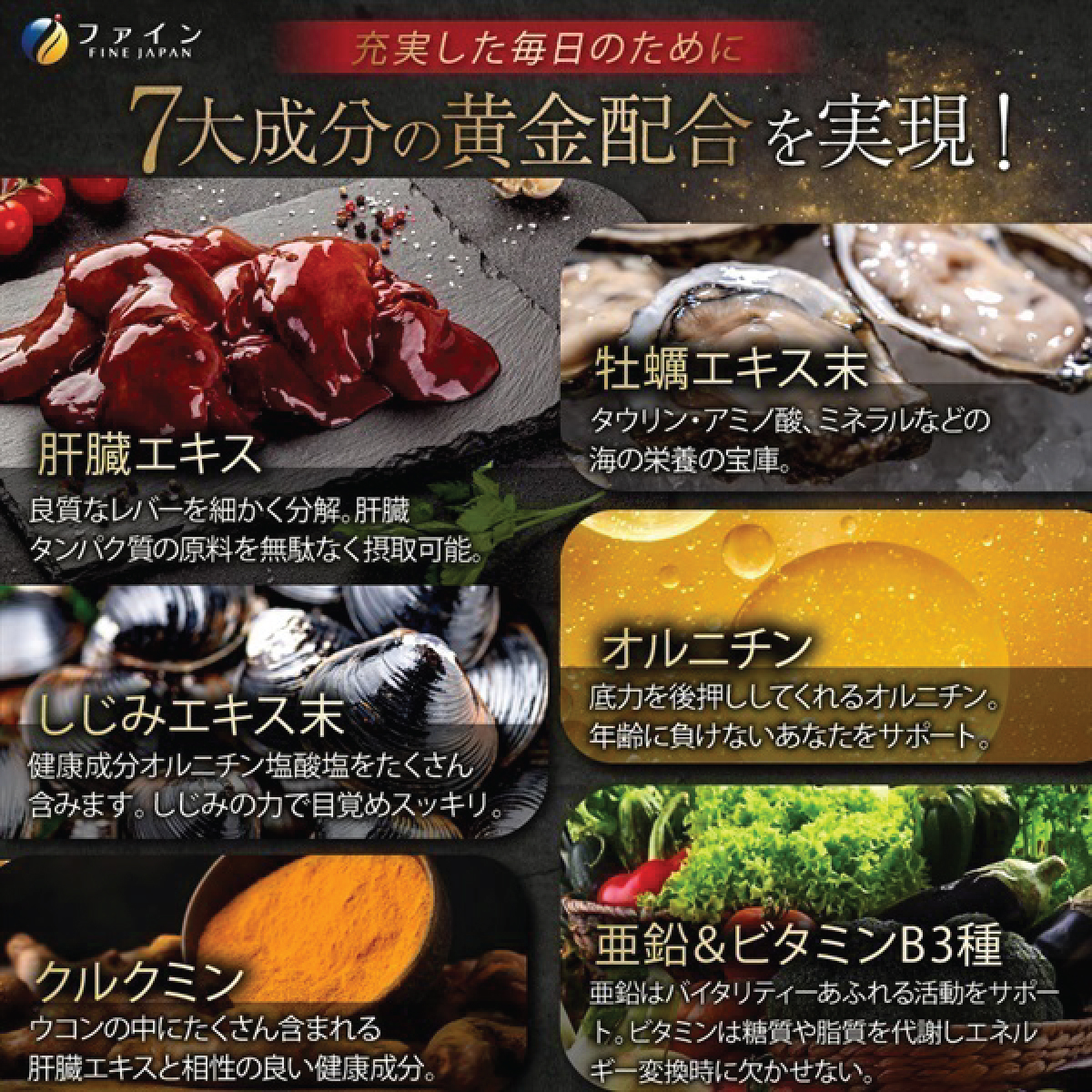 牡蠣提取物粉末、肝髒水解物、蚌肉提取物粉末、薑黃提取物、L-鳥氨酸鹽酸鹽、鳥氨酸粉末/甘油、葡萄糖酸鋅、紅花油、明膠、蜂蠟、乳化劑(甘油脂肪酸酯/完全氫化脂)、抗氧化劑(維他命E)、可可色素、維他命B1、維他命B2、維他命B6、(包括一些豬肉和明膠)