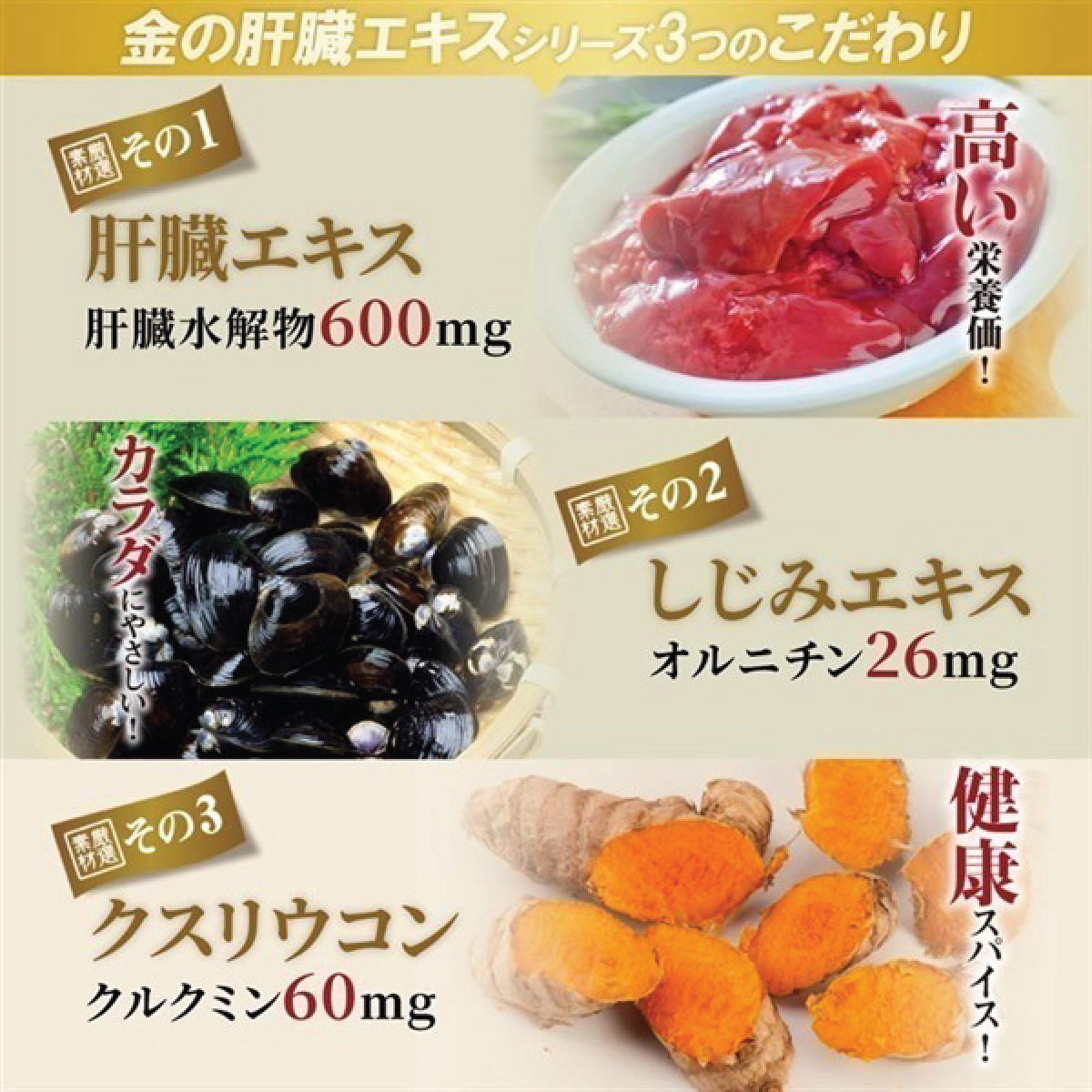 紅花油,明膠,豬肝水解物,鋅酵母,蛤蜊萃取物粉末,薑黃提取物,薑黃粉,鳥氨酸/甘油,上光劑 (蜂蠟)蜂蠟,色素(醬色I),水分保持劑(甘油),抗氧化劑(維生素E),維生素B 1,維生素 B 6,維生素B 2。