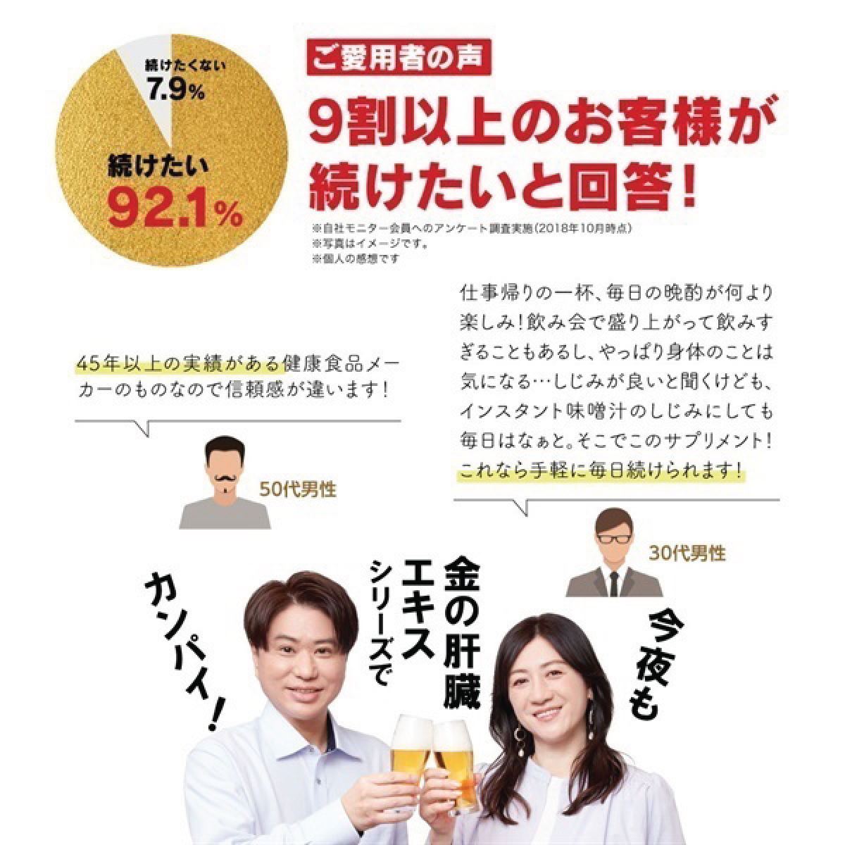 薑黃素含有2.6倍精華,蛤蜊萃取物,鋅酵母,鳥氨酸幫助肝臟修補受損,改善肝功能,幫助肝臟排除氨毒,預防宿醉,熬夜後的疲勞感,針對日常飲食不平衡,晚上經常喝酒應酬的都市人,從而疲勞中恢復過來,帶給每天早上精神及動力上班工作。