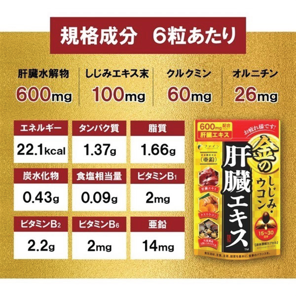 紅花油,明膠,豬肝水解物,鋅酵母,蛤蜊萃取物粉末,薑黃提取物,薑黃粉,鳥氨酸/甘油,上光劑 (蜂蠟)蜂蠟,色素(醬色I),水分保持劑(甘油),抗氧化劑(維生素E),維生素B 1,維生素 B 6,維生素B 2。。