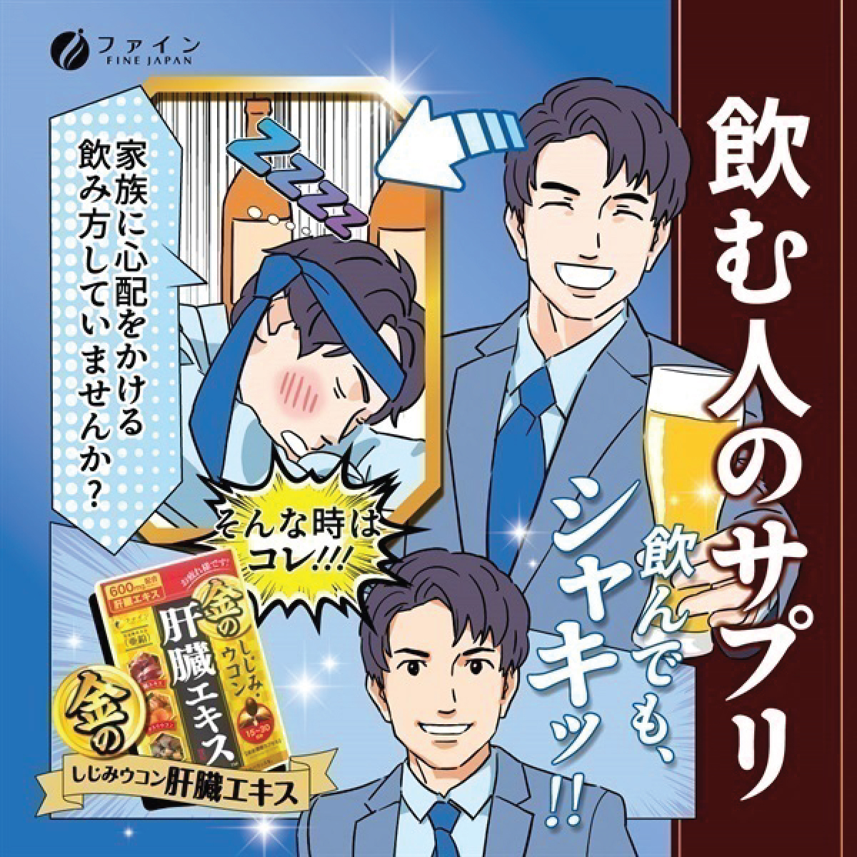 薑黃素含有2.6倍精華,蛤蜊萃取物,鋅酵母,鳥氨酸幫助肝臟修補受損,改善肝功能,幫助肝臟排除氨毒,預防宿醉,熬夜後的疲勞感,針對日常飲食不平衡,晚上經常喝酒應酬的都市人,從而疲勞中恢復過來,帶給每天早上精神及動力上班工作。