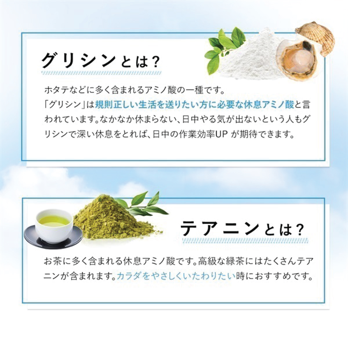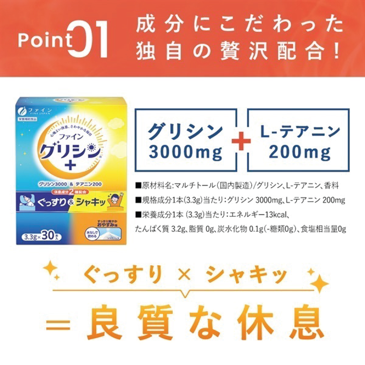 採用促進輕鬆及休息的成份—甘氨酸及L-茶氨酸,對腦部有安定作用,消除神經緊張,改善失眠問題。