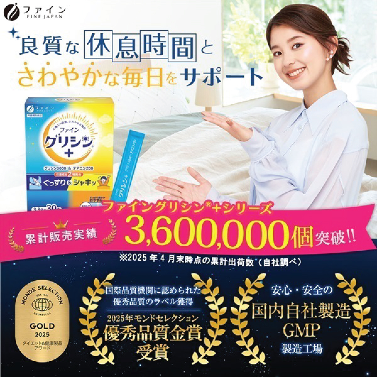 Fine Glycine®系列於日本累積銷售已超過300萬!(截止2022年1月的銷售數字)為現代生活中繁忙的成年人提供一個深層的休息及精神爽利的早上。