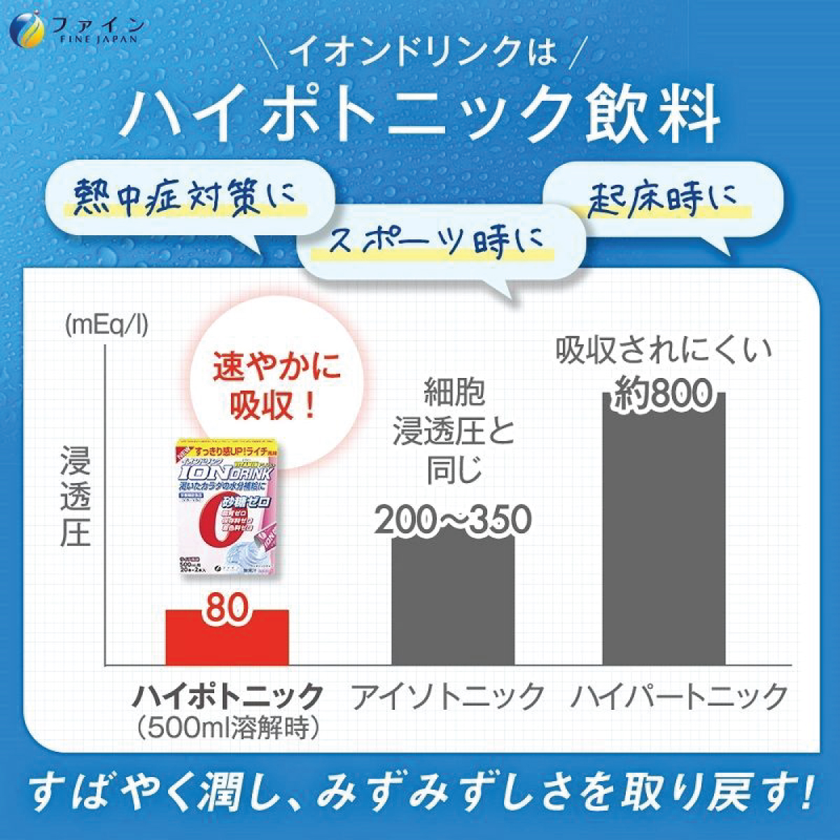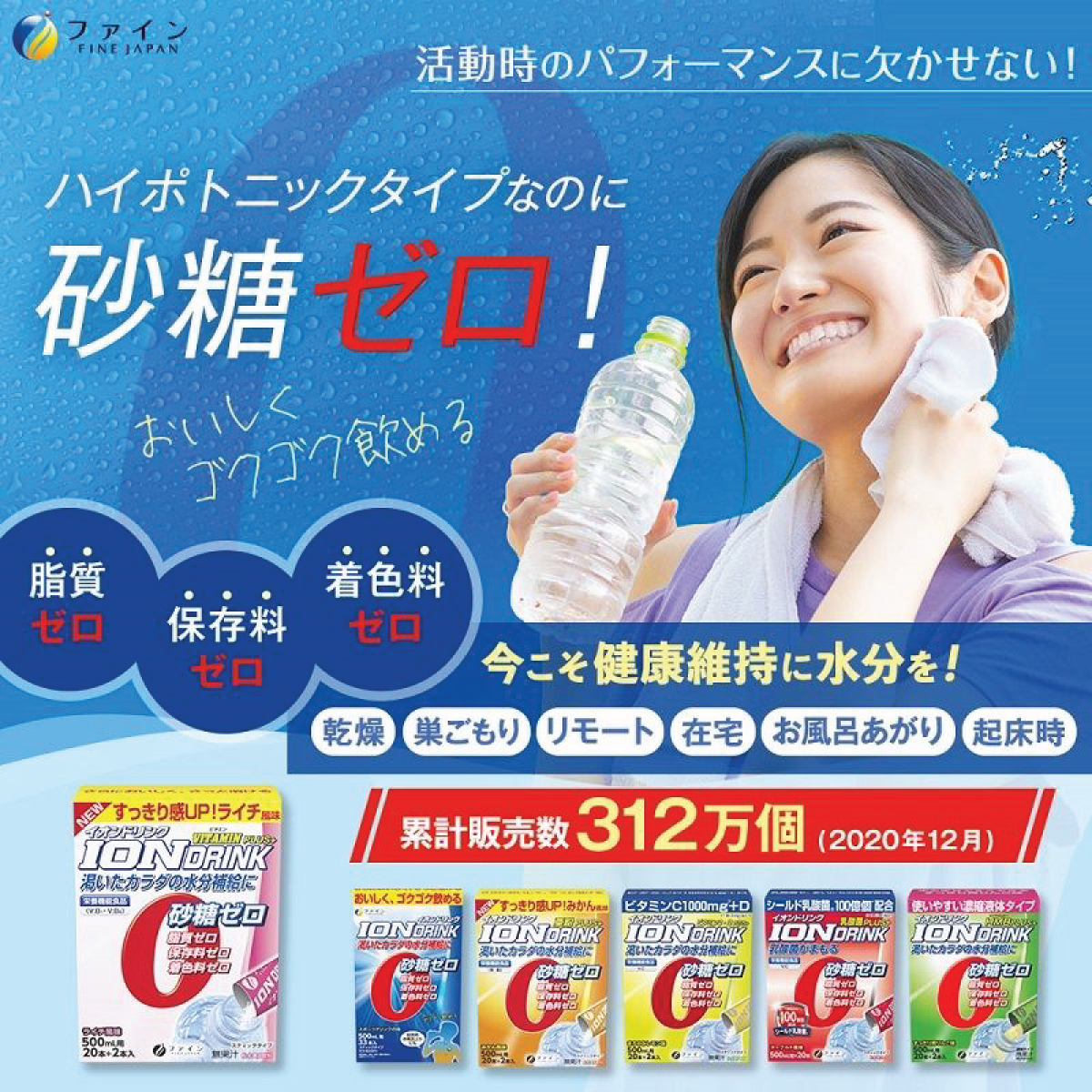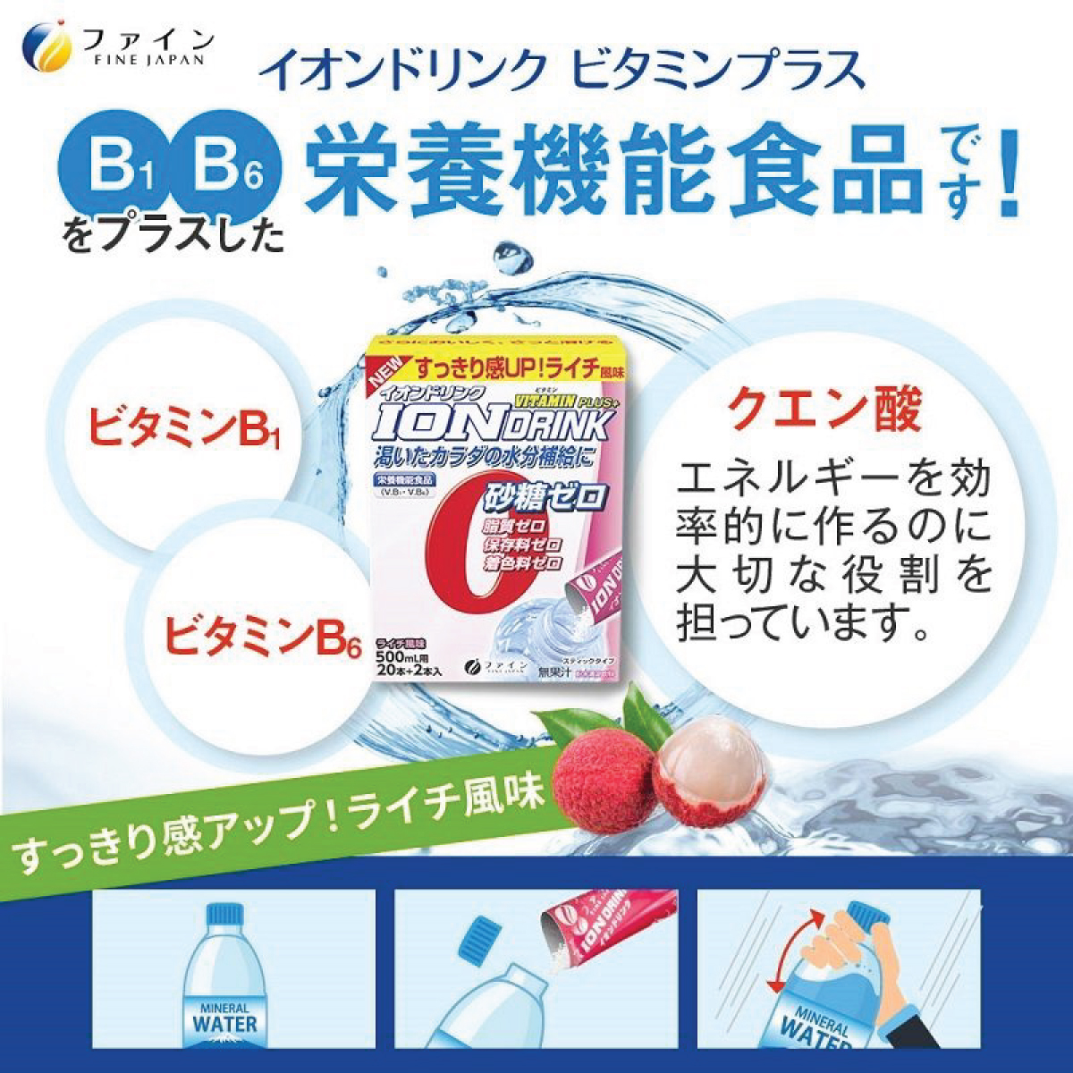 運動的同時,鹽分會隨著汗水一起流失,適當地攝取含有鹽分的飲料是非常重要。為了補充大量流汗所流失的水分與礦物質,Ion運動電解質補充飲(維他命)特別加入維他命B1、B6,能迅速補充運動後流失的水份和電解質,而且對於脫水後的回復及防止在炎熱天氣下中暑效果亦顯著。