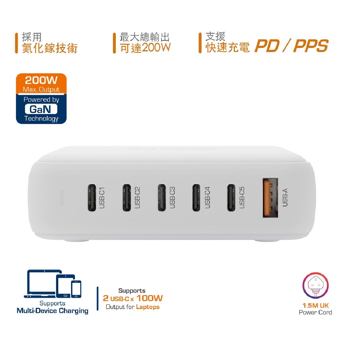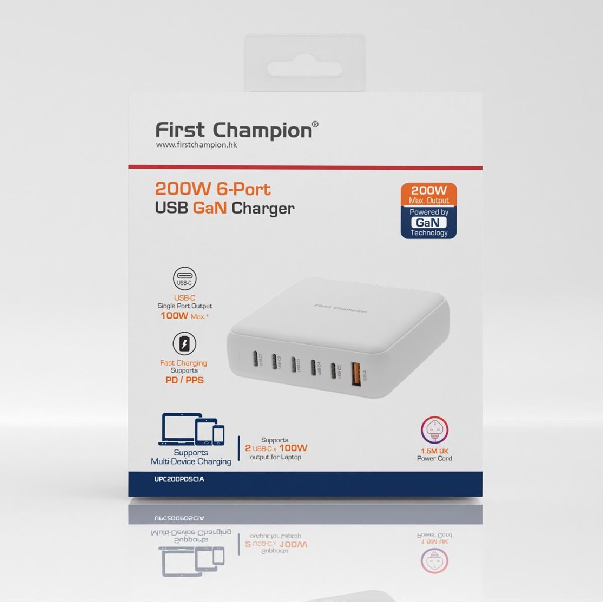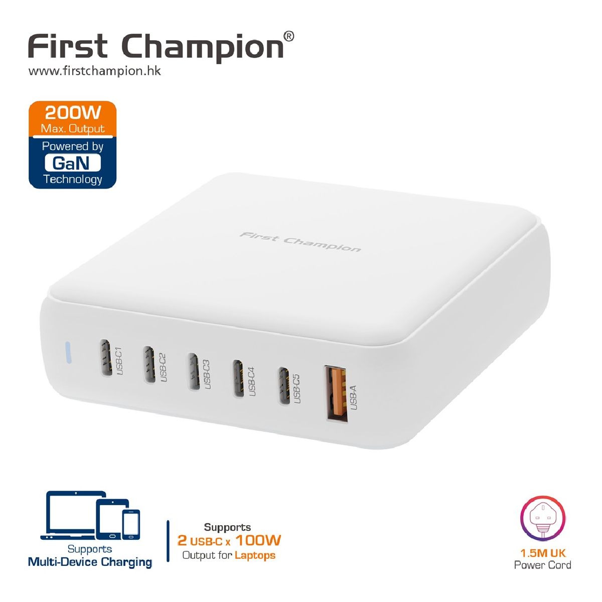 First Champion- USB 桌上 氮化鎵(GaN) 快速充電器 200W, UPC200PD5C1A- with USB-C PD & USB-A
