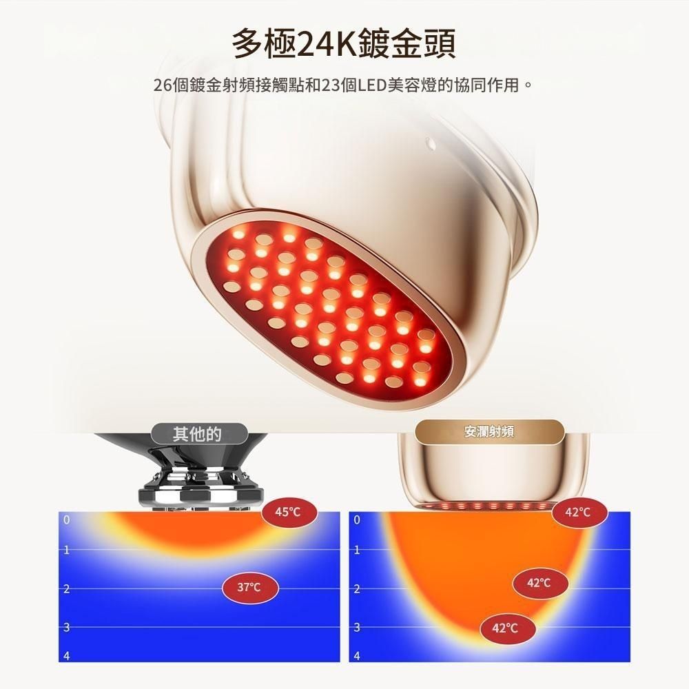 RF + 紅光 (615-650nm):刺激膠原蛋白生成,增強彈性,抗衰老,提亮肌膚。