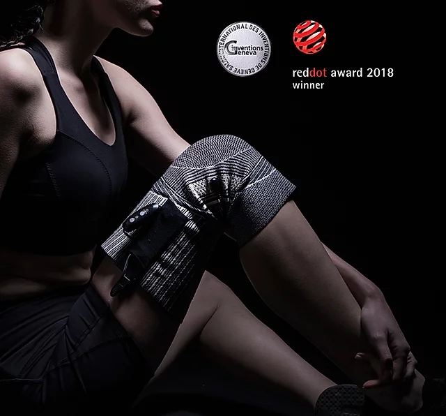 「智能發熱護膝」運用KnitWarm的技術,集合科研經驗及創新設計。團隊翻閱文獻,再將意念、資訊集合在一起,透過溫熱幫助人體血液循環、紓緩關節痛症、還籍著時尚設計提升生活質素。因應人體關節郁動及腿部粗幼,以不同針織圖案編織而成。除提高護膝彈性外,更確保穿着時可緊貼身體不同位置。