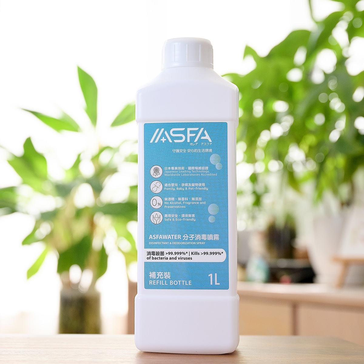憑著日本專業技術,ASFAWATER 能快速殺滅細菌、病毒(Covid19)、真菌及芽孢菌>99.999%*,同時有效分解致敏源,甲醛VOCs,去除煙味、霉味等異味,使用後分解成水,天然無害。本產品不含酒精、不刺激、不敏感#,可以直接噴於空氣及雙手進行消毒,適用於為嬰兒玩具,餐具,睡房,客廳,浴室,廚房,車廂和公共場所進行消毒和去除異味。嬰兒,孕婦及寵物均適合使用。鼻敏感症狀、敏感皮膚及濕疹皮膚嬰孩均適合使用。