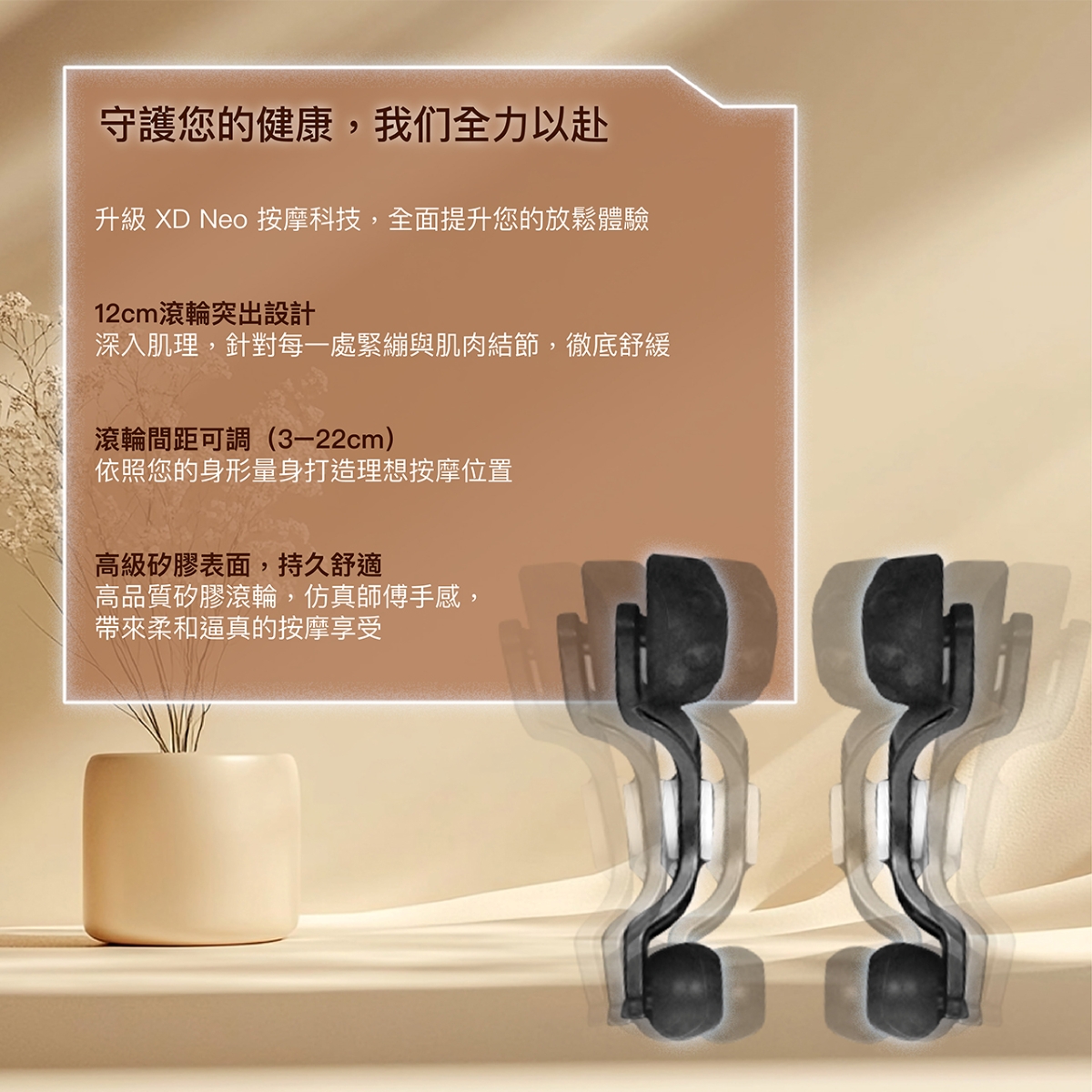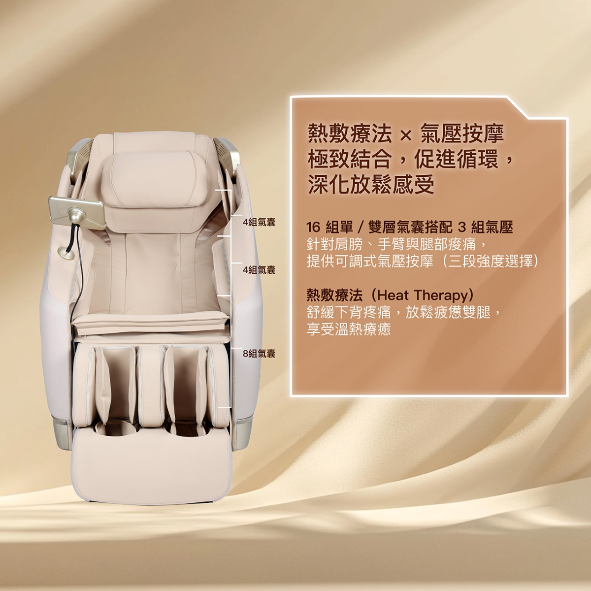 • 肩部、手部、腿部共設有16個按摩氣囊