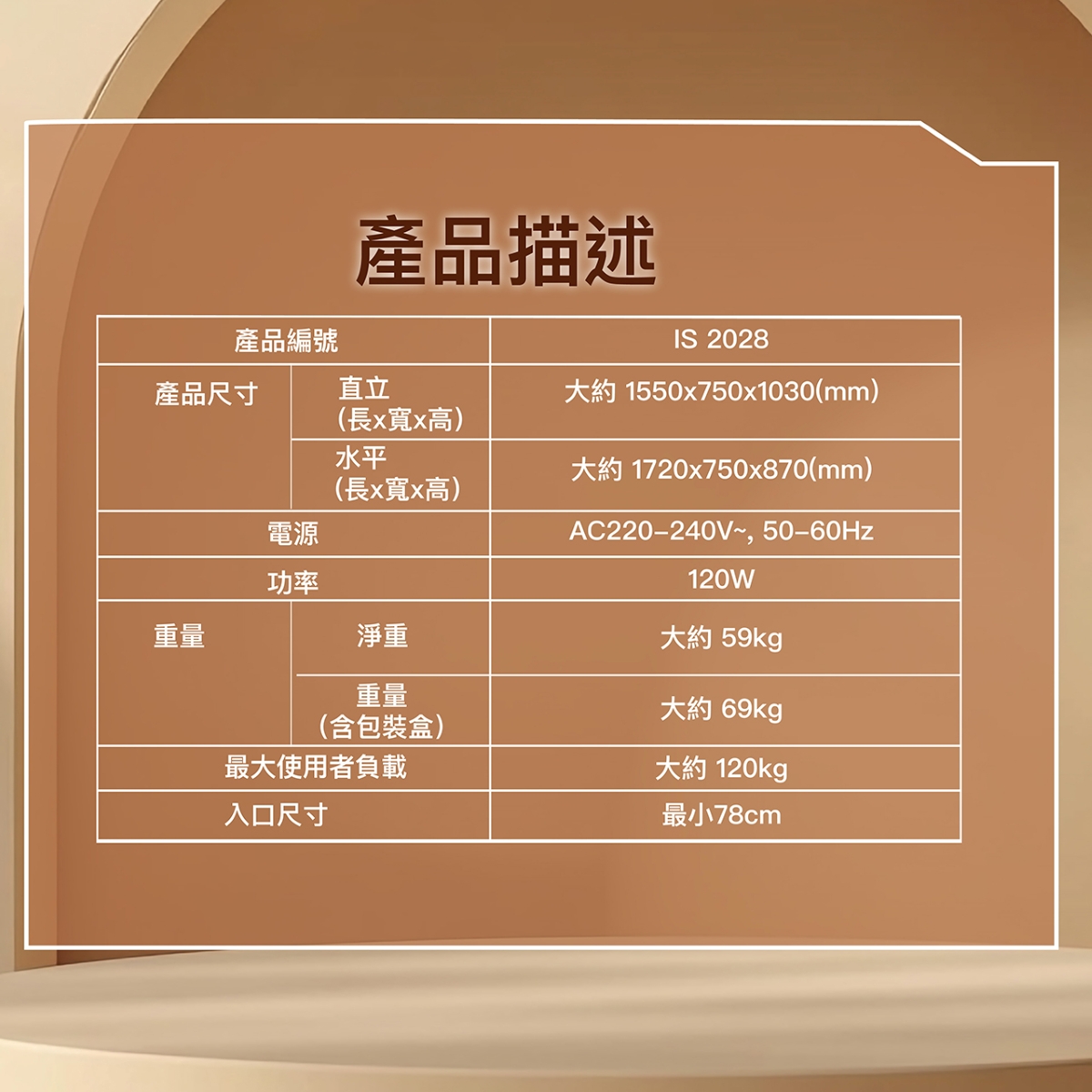 • 用戶最大體重: 約120kg